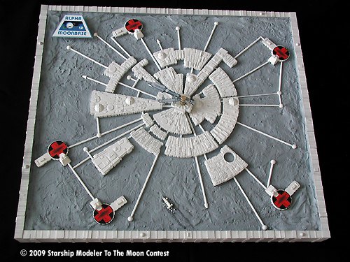For me, the ultimate expression of man's hope to colonize the moon is Moonbase Alpha from the television series "Space: 1999". This model is a kit bash of the AMT/Ertl Moonbase Alpha kit. I decided that it would make a nice clock, so I discarded the "Main Mission" building and the awful thin, plastic lunar surface. I built a frame using 1/4" MDF and a masonite sheet. The frame detailing was done using sheet styrene in the style of the moonbase buildings. I borrowed this idea from a similar product that was once offered by Jim Small. The lunar surface was made using Bondo auto body filler. I added craters and other details with a round Dremel drill head. The Ultraprobe and Eagle clock hands are stickers courtesy of Small Art Works (EIMB). I built the missing launch pads (only 3 are provided in the kit) and added additional travel tubes and details with Evergreen styrene tubing.