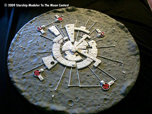 For this model, I started with a 17" disk that I cut out of a 1/16" thick sheet of styrene. On that I formed the moon surface out of 2 1/2 pounds of Aves' Apoxie Sculpt, using various spheres, etc. to make the craters. I had to buy two "Alpha Moonbase" kits in order to have the correct number of Eagle landing pads, radiation domes (the travel-tube end-domes), and flammable materials bunkers (the cone shaped travel-tube ends). I corrected the shape of a few of the buildings with styrene sheet, and also scratchbuilt one small building that didn't come with the kit. I added the triangular docking area on all the Eagle landing pads. Then I cut 44 lengths of coat-hanger wire to use for the travel tubes. I didn't have any reference photos for the Laser Batteries, and I couldn't remember what they looked like, so I just made five little offset cannons tipped with the leftover radar dishes from the Nostromo model to give them a sort of "ray-gun" look. I painted the moon surface with Model Masters Neutral Gray, and the moonbase with Model Masters Flat White. Then I glued the whole thing to the moon surface with Elmer's Craft Glue. I used a map of Moonbase Alpha that I found online as a guide. There are two Eagle Transporters on their landing pads. One is a standard Eagle, and the other is a Rescue Eagle. The Rescue Eagle is on the landing pad nearest the Medical Center, and has a docking tunnel hooked up to it. There is also a hole in the back so that the whole thing can be hung on a wall.