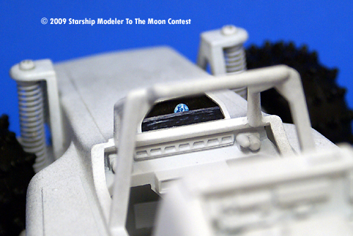 Once everything was done, parts were primer coated, then painted flat white. To lightly dirty up the vehicle, it was sprayed lightly with semi flat black. To add a very small touch of color, a moonscape was printed and attached on the vehicle's Heads Up Display.