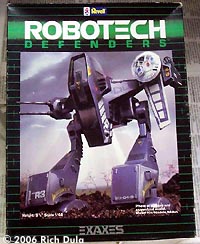I had purchased a Robotech Defenders Exaxes kit on eBay in 2005, and the kit had been sitting on my stock shelf for some time, so I figured “what the heck” and decided to build it. Now, I should clarify that I have built this kit before, back in the 1980's when it was first released by Revell. That kit was a casualty of a BB gun war sometime around 1985, taking heavy impact damage before a lit M-80 was dropped right between its legs. What You Get As John Lester noted in his preview article about this kit, the Exaxes was originally the Ishform from Studio Nue's Super Dimension Century Orguss anime series. In fact, the Revell kit still carries the Orguss ID tags on the sprues, as well as the A, B, and C designations. The kit includes three primary sprues of parts that are molded in purple, one secondary purple sprue (with the instrument panels), one sprue of clear parts, and a sprue of 28 rubber polycaps.The Exaxes was designed as a two-man recon 'Mech for use in rough terrain. It is lightly armed, with a twin-barrel cannon mount on the right shoulder, and a large sensor dish on the left shoulder. Aside from the cannon, the 'Mech doesn't appear to carry any other weapons. The instructions that are provided are laid out in a 12-page booklet with 39 steps. The last step shows the placement of the decals. The decals themselves are fairly representative of those on most kits during the 1980's. They have lots of carrier film and are generally thick. A couple of the smaller ones were slightly off-register, but still didn't look too bad. The Build-Up For an older vintage kit, this one is not that bad. There was minimal flash on the parts, and some minor sinkholes. There were four main sinkholes that I encountered during construction, two that were on the exterior of the kit, and two on the interior. The first step in the instructions deals with building what is more or less the waist of the 'Mech. I immediately started painting the base color on the various parts prior to assembly. The actual engine section was painted with Testor's flat black paint and then dry-brushed with MM Chrome Silver. You have to do your detail painting before assembling the two engine parts because they slide into a circular section on the back side of the waist area. Once they are in place, you will have one heck of a time trying to paint them. Steps 4 and 5 are the first point where you encounter sinkholes. The exterior ones that I mentioned earlier were on parts B15 and B16, which are the lower brackets coming from the engine area and bending into the hip portion of the 'Mech. I assembled the parts as shown and attached them to the engine area. Then I simply filled in the sinkholes with some super glue and sanded the glue down flush with the surrounding surface. In Step 7 it isn't clear from the instructions whether parts B5 and B6 are supposed to be glued in place, or if they are supposed to be left loose. These parts act as the hip joint covers and cover the pivot points for the legs. I ended up attaching them with super glue and locking them in place, otherwise they were flopping all over the place and could (and did) slip off quite easily. Step 10 starts construction of the legs, and here is where you might need a Dremel or a small cordless drill. Steps 10 and 11 deal with building the knees of the 'Mech, and you will need some clamps to hold these parts together while they're drying. Likewise, you will also need the clamps during steps 13 and 15, when you are attaching the upper legs by positioning the parts with pins running through the parts assembled in steps 10 and 11. |
