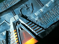 Following the success of the 1994 film "Stargate," Stargate SG-1 debuted in 1997. Remarkably successfull for a sci-fi show, it has run ten seasons and spun off at least one other series (Stargate Atlantis in 2004; a third series is in development as of this writing). The premise is that the U.S. government created Stargate Command to explore the galaxy and acquire advanced technologies to defend Earth, using an ancient alien artifact called the Stargate. This device connects to other, similiar "gates" via instaneous "subspace wormholes". From relatively simple beginnings, the show has grown to encompass dozens of alien races, huge space armadas ... and all the drama and excitement you could ask from a good space opera. Images courtesy of "Dave", who adds "I don't have any pictures handy, but we did a lot of different angles of the 'gate opening'. This was done by simply blowing air into water (exactly what it looks like!), using a massive glass tank as a containment vessel, so that we could cover a number of angles for future use." |