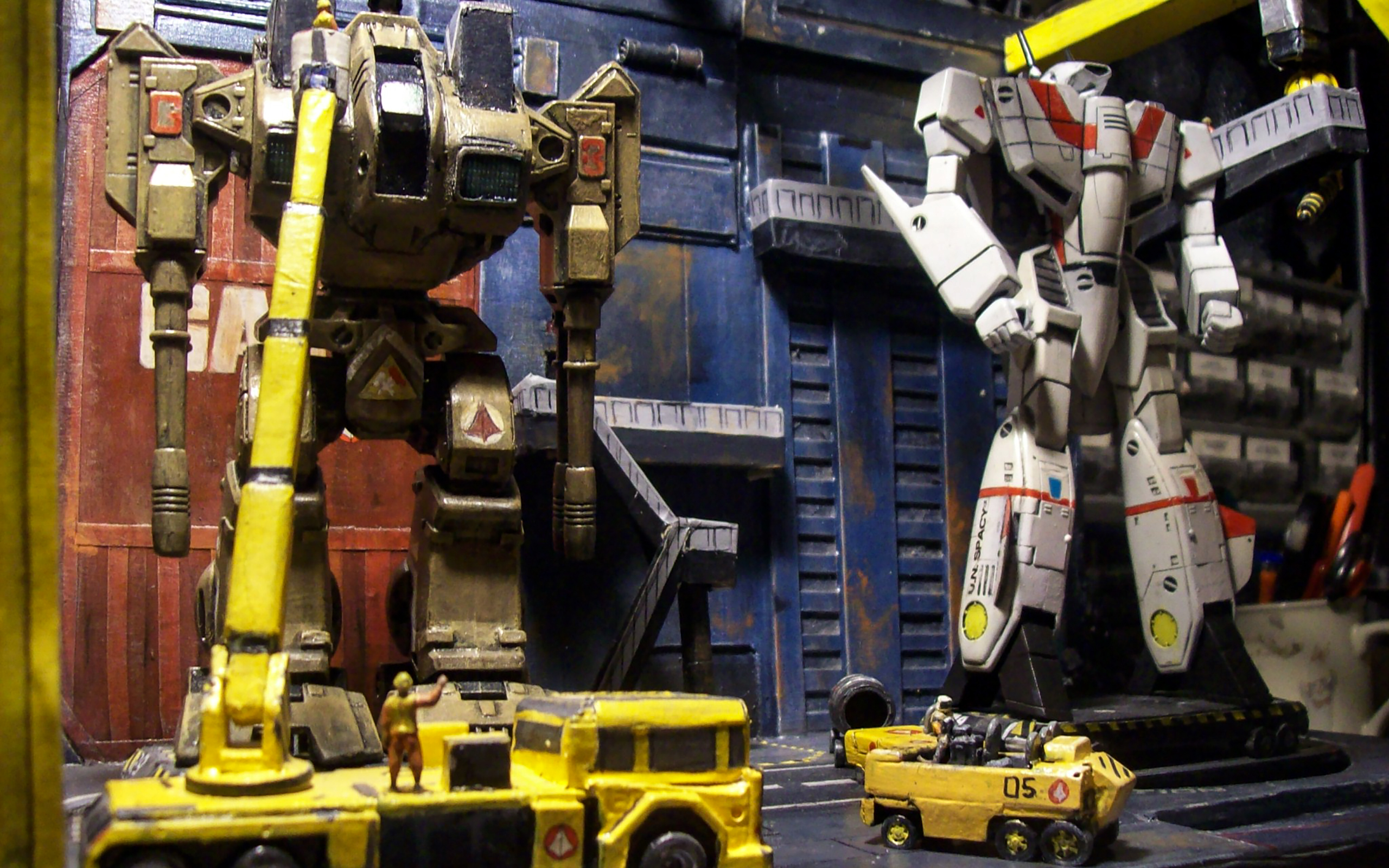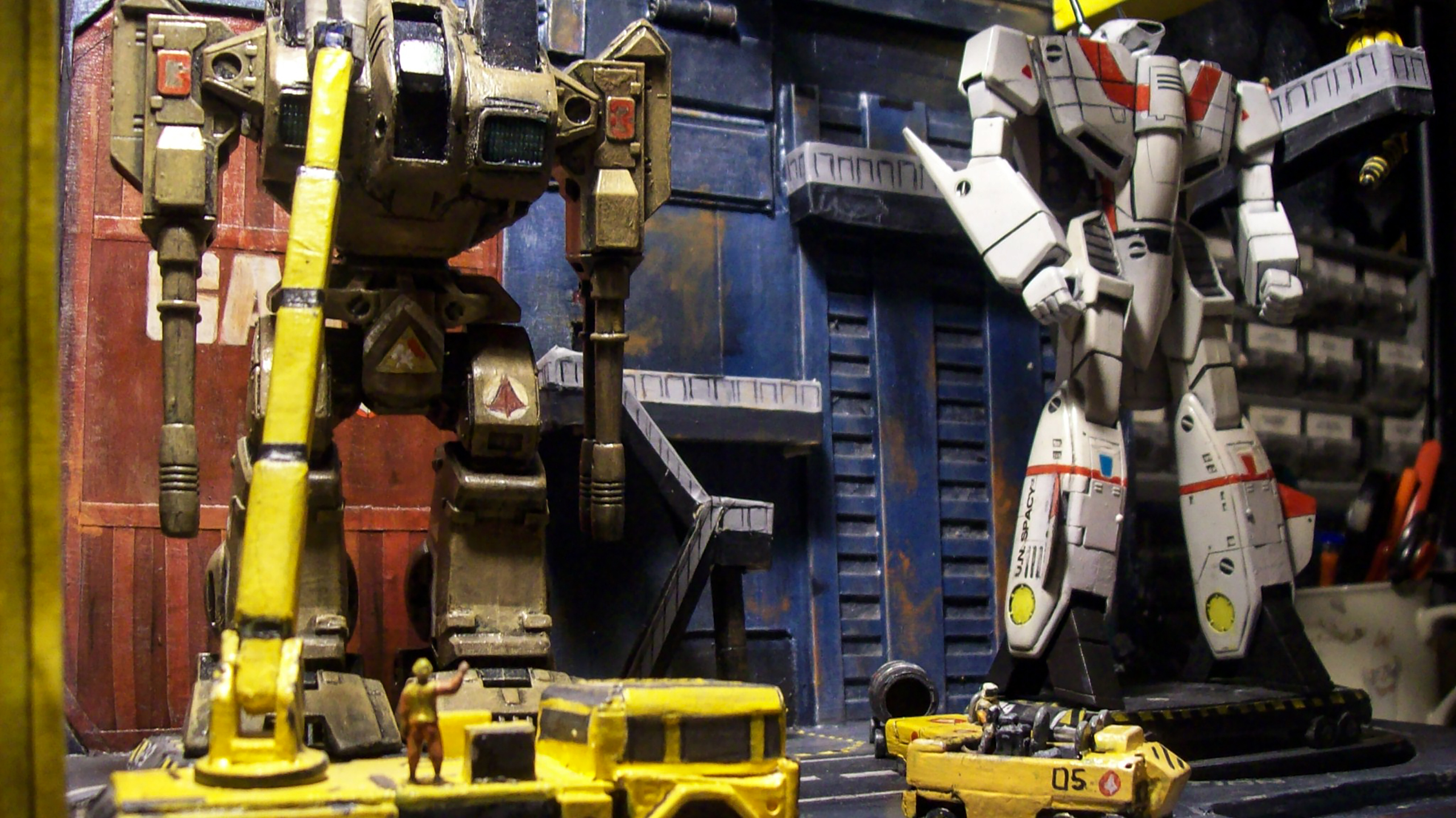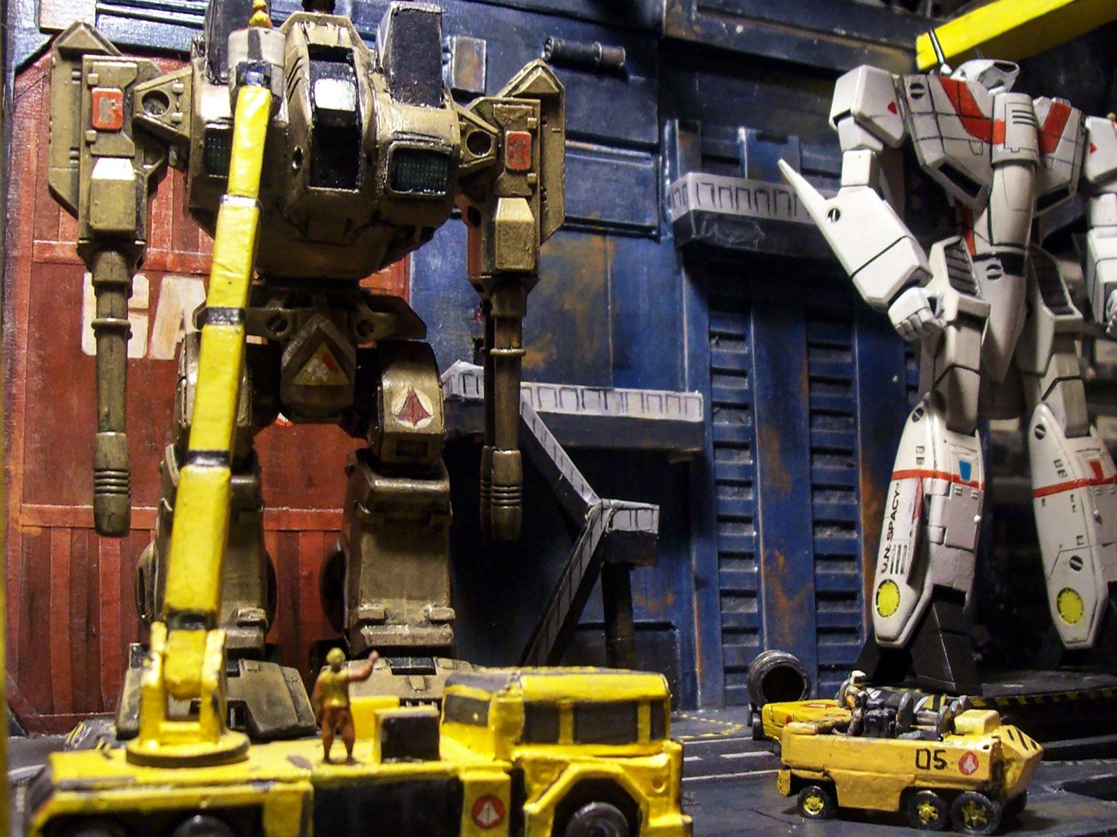 April 2026. Robert Stimpson's scratch-built 1/72 Macross Armored Factory, built from matboard, styrene and masking tape. The Destroid is a Playmates reissue of a Matchbox Robotech 1/72 "Raidar X" (Macross ADR-04-Mk X in reality) that was tweaked and repainted, while the VF-1J Valkyrie is an Imai VF-1 transformable kit that has been customized into Hikaru Ichijo's (Rick Hunter in Robotech) colors. The vehicles were all scratchbuilt, while the 1/72 figures (painted as Macross personnel) are from Italeri's 1/72 NATO Flight Crew kit.