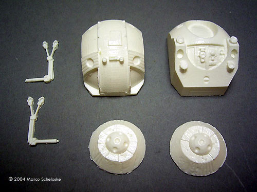 The company "The 4th Axis“ is offering a nice collection of christmas ornaments from the famous classic movie "2001 - A Space Odyssey“. Christmas Ornaments? No, small, wallet-friendly models! So let us have a look what you can get for your money, but keep in mind that they are not designated to be 200% accurate replicas, but nice Christmas decorations... The Space Station The kit contains 6 parts made of white resin, 4 for the two wheels and 2 for the hub. There is a lot of extreme thin flash between the "spokes“ of each wheel, but this can be removed easily with a sharp hobbyknife. More disturbing are a few bubbles in the area of the hangardeck, but there are really just a few. No instructions are available, but you don`t need them. The model comes with a small hook to hang it in the tree - well, I will not need that... Dryfitting the parts shows that you will have to deal with a very obvious seam along each wheel - patience will be needed to take care of that, especially at the second wheel with all its framework. But the fit of the halves is good. It will be a bit tricky to paint the framework of the nonfinished wheel, but worth the effort. As far as I can say the model will be accurate, especially for its small size. To compare it with the larger and much more expensive Comet-version would be like comparing apples and pears. Altogeteher a nice two-weekend-project, an interesting addition to any 2001-collection and well worth the money. The One-Man pod This kit comes with 6 white resin parts, 4 silver and one red "gem“ for the lights and HAL's eye (take care of them - they are really small, I lost mine before I could make the pictures... modelers, always beware of your cats!), and the hanging-hook. The arms are surounded by thin flash, but this is not a big deal. The other parts are "ready to use“. The kit comes also without instructions or decals. The casting quality is not as good as the one of the spacestation - the complete surface is a bit rough, the details (especially under the windshield and the exhausts of the "earmuffs“) are not really sharp. You`ll have a seamline in the middle of the fuselage, but this one will be easier to handel than the ones on the spacestation-wheels. The level of detail is ok, but a few things should be mentioned: The arms are flat on the inner sides and not really 3-dimensional. To get rid off a toy-like look it will be necessary to make some detail on this sides out of sheet styrene. The details below the windshield are a bit out of position (to far to the right), but acceptable. The angle of the windshield-frame is a bit to steep. One really big error is on the back of the pod: The door is raised, but it should be inset! I see no way to fix this yet without very much surgery. Conclusions So a non-accurate model, better not to recommend it? NO! As I mentioned above, keep in mind that this is a decoration, not a replica! It would be unfair to compare it with high-level models like the one available from Captain Cardboard. You`re able to add a spacepod to your collection in a price range explainable to your companion, and with a little work it will look convincing. If I would have to choose, I would get it again. |