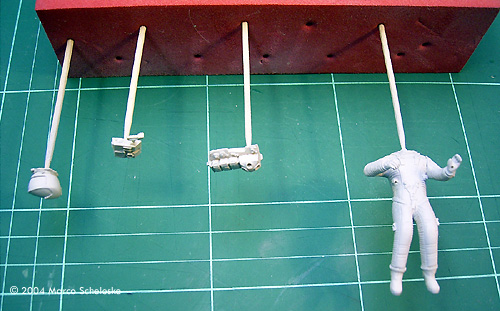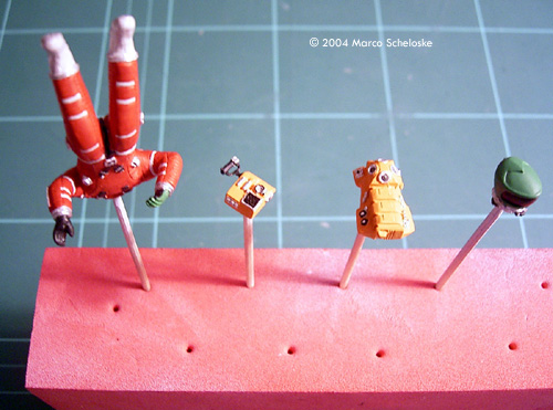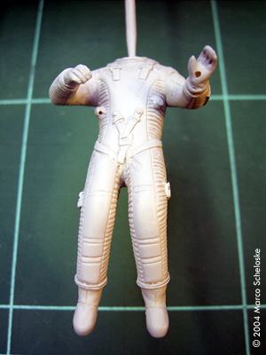 ![]() I became aware of that kit through the previews posted here at Starship Modeler. Being a big fan of "2001" and of small models I didn`t hesitate to order one - and I don`t regret it! The detail of that small kit is fantastic, the casting quality excellent. But let me tell you step by step: Assembly I chose to glue the arms to the body before I started to paint the figure. The add-on parts (helmet, chest- and backpack, tubes, HAL shutdown key) were painted seperately (temporarily mounted on toothpicks) and attached later. |