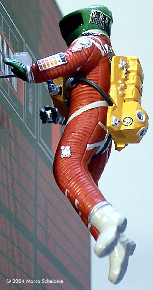 I added the decals to the chestpack, then I mounted it to the body. The next piece that got its decals was the backpack, followed by the helmet and finally the left arm of the figure (patch and touchpad). Everything was sealed with a clear dull coat. I have had problems with the fit of the decal for the helmet modules, I guess it should be a bit curved to fit correctly instead of being straight as it is. Finally I found a position that looked more or less right. All other decals are fitting perfect and are very well sized - no trimming needed. Helmet and backpack were glued to the body - there is only one correct position which is easy to find. The last pieces that I attached were the tubes. I broke the one that goes from the chestpack to the backpack, I replaced it with a bend and black painted wire. The only thing left to do was now to glue the steel rod into the small hole of the left hand, to choose a position at the wall of the display, to drill a small hole there and to glue the complete figure onto it. I let it float in a little distance to the wall, just a few millimeters, to simulate the zero-G environment. Conclusion The short form: I love it! But: As easy as this kit is to build, I would not recommend it for a beginner because of the tricky paintjob due of the small size of the model. I highly recommend it to modelers who has the necessary experience and patience for the paintjob (I can tell you that a coup of coffee is poison when you try to paint it or to apply the tiny decals), you will hardly find a better casted resin model. The problem with the blurred background is solved, I only wish the instructions would go more into detail about the painting and the decal placement. But that is all I can find to complain about - really not much, right? I have had a lot of fun building that model, now I ordered another of the 2001 figures from EVA models - I guess that says it all, doesn't it? If you can get it, take it! |