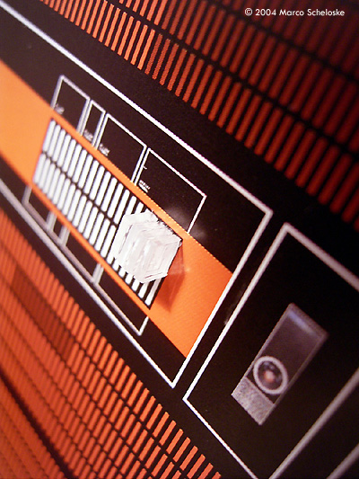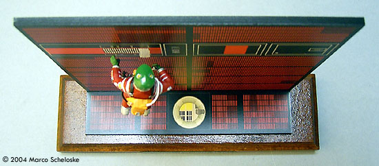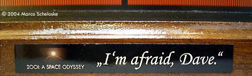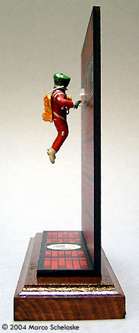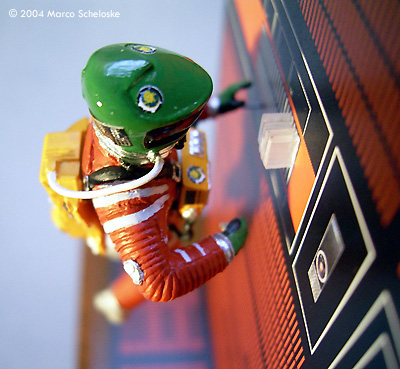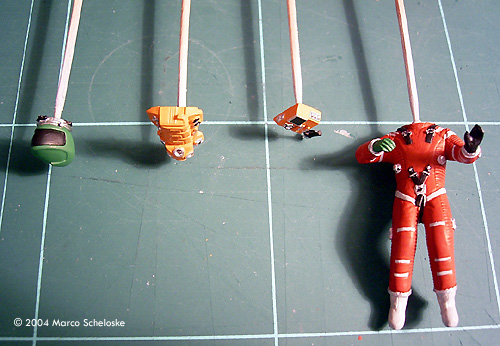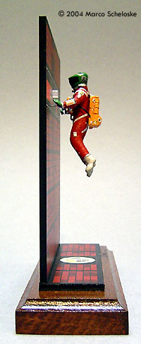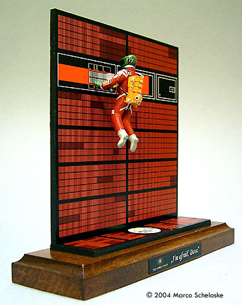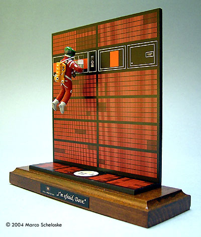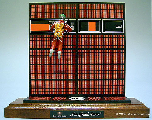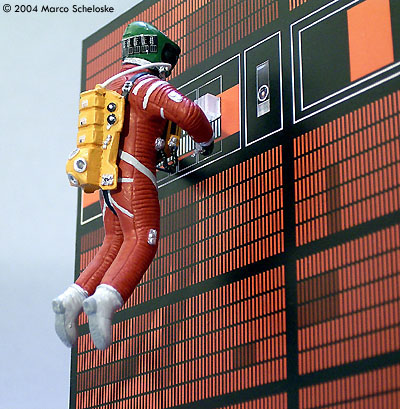 The parts needed minor sanding here and there, which was done very quickly. A little seam between the arms and the body was filled with gap-filling superglue. Instead of drilling a small hole into the bottom of the helmet I sanded this area and the top of the neck flat. Painting and Detailing The instructions are not very detailed regarding the paintjob, so I collected a couple of reference pictures, and I watched several scenes of the DVD over and over again, zooming in here, zooming in there. When I felt I was prepared enough I started to paint. The primer is a light grey from a spraycan. I started the main paintjob with the grey and black straps of the suit, followed by the silver buckles. Some may think that it is a strange idea to paint the details before the main color, but in that way I was able to paint the sides of those details too without damaging the base color of the suit. I used this technique on my much bigger Luner Models Astronaut & Ape diorama too with great success. During the drying time I painted the other parts. The chest- and backpack with a self-mixed orange (using Blood Red and Golden Yellow from Games Workshop), the helmet green (Bowman wore the helmet and gloves from the backup suit in the airlock), the tubes black and the airtube of the helmet light grey. Now back to the suit: I mixed Games Workshop Blood Red and Red Gore in a 1:1 ratio to get the color I want. The complete suit was painted with this one. When it was dry I added the silver details and the grey boots. I made their sole a bit darker then the rest. Silver and black details were also added to the packs, as well as the black visor of the helmet. Finally the helmet was gloss coated. I needed a couple of days for the paintjob because I let every layer of color dry very well. All Your Base .... A background picture showing the HAL-room was included in the kit, but it was blurred a bit. Not a big deal for a model you will look at from a distance, but you will stick your nose to this one to be able to see every tiny detail (ok, at least I will). So I chose to draw a new background, using the included one as a guide. I made it with Macromedia Freehand, printed it on a HP INDIGO digital offset printing press, and so I got a vector based, sharp background picture to use with my model. Now the really good part: This NEW picture will be used for all kits EVA models is going to sell in the future - I gave the file to the owner, and he liked it so much that he decided to use it from now on instead of the original one! The picture is only the starting point of the base. I used 3 mm thick black foamboard (as suggested in the instructions) as the floor and the wall, the print has been glued onto that. Now the wall was glued on the floor - be sure to have a real right angle! To add a bit more detail to the base I made 4 small clear bits to represent the already unlocked HAL memory modules. Bowman held the key in his right hand, so 5 would have been the maximum - he changed the key into his left hand to go on with the shutdown (yes, I watched that scene really often...). The complete background was mounted on a stained wooden base, together with a self-made nameplate, showing a screenshot of the opening sequence of "2001“ together with HAL`s line "I`m afraid, Dave.“ With 5 memory modules unlocked it would have been "My mind is going.“, but I like the first one more because it gives a feeling of how close HAL is to being alive. Finishing Touches The decals are very tiny, and a bit out of register (at least the sheet in my kit). No big deal in that small scale, and they are really helpful for an accurate finish. |