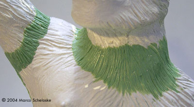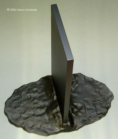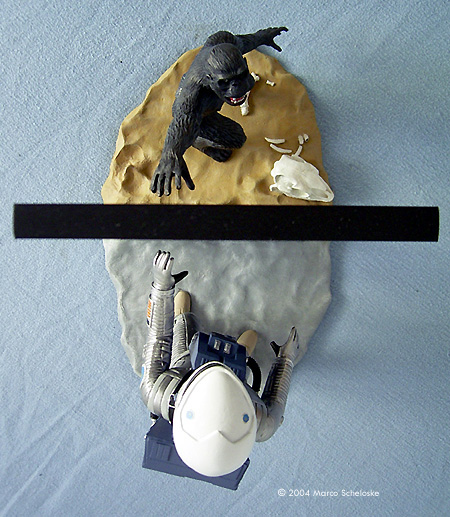 The Monolith, made of sheet styrene, got a semigloss black color by Revell out of a spraycan - I did this three times because every time a few dust particles managed to make themselves self-important... so I had to sand and spray again. Finally it worked very well. The bones at the apeside of the base and the skull have a basecolor of "bleached bone", drybrushed with flat white. The base itself was painted in two ways to show the different places (earth / moon): The earth side is painted completely with Revell #89 "sand", then drybrushed with a lighter shade of the same color. The moon got a layer of Testors / Model Masters "gunship gray". Following that it was drybrushed with "canadian voodoo gray" and "FS light gray". I used no airbrush fot this task (I feared to damage the black paint of the monolith, either by color-splashes or with masking tape), but blended the colors into eachother where the bases met just by drybrushing.