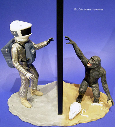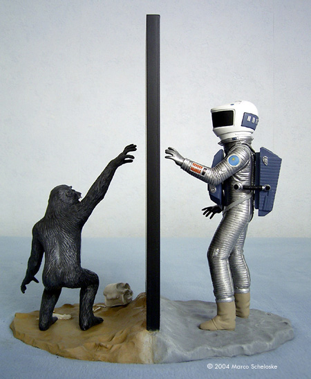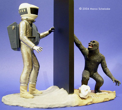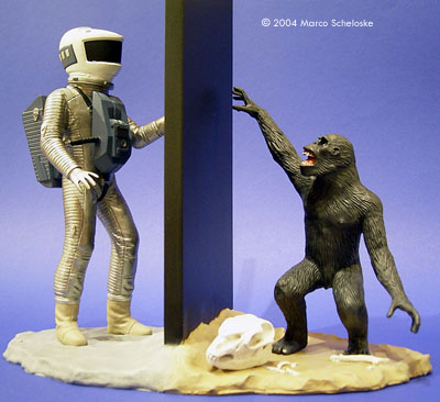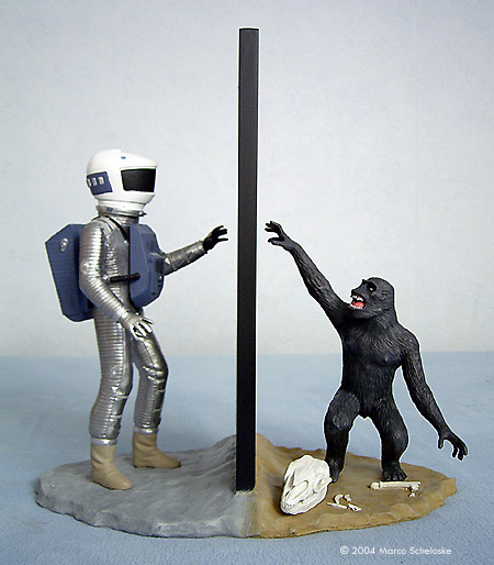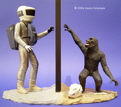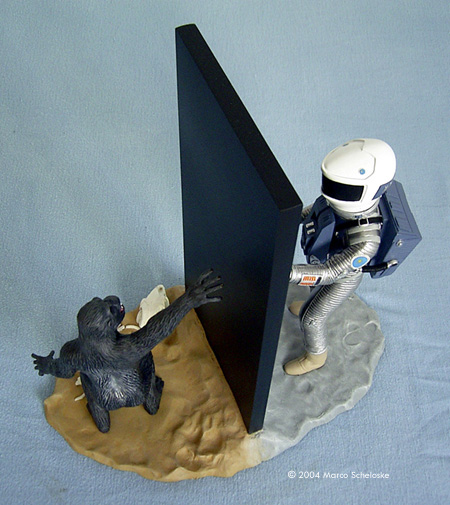 Image: Using putty to re-create detail at the joints Image: Astronaut's arm, as it came in the kit Image: Ape, after drybrushing Image: Ape's face Image: Astronaut's helmet Image: Astronaut, left/rear view Image: Rear view Image: Skull Image: Monolith Image: Back side Image: Good look at the base Image: Closer look at the ape .... Image: ... and at the astronaut. |