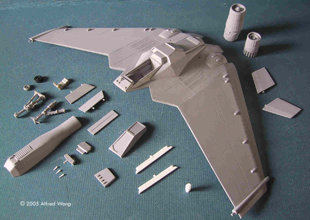 What a long and winding road this particular model has taken from inception to sitting in my display case... Backstory I commissioned the master pattern for this kit in 2005. As with a lot of sci-fi subjects, there were challenges to making an accurate model: few readily available references (at the time), differences between full-sized mockups and CGI/filming models, constant evolution of detail over the course of the TV shows (the original from season 5 of SG-1 is only generally similar to that seen at the end of SG: Atlantis), and the usual “it won't fit” problems (as in there's no way the retracted nose gear can be stored under the cockpit - there's just no room for it). The master, when it arrived, looked fairly good in proportions and outline - with one glaring error. As you can see in the picture, the dogtooth along the leading edge of the wings was the wrong shape (it should go straight to the cockpit, not having the wedge shape). I was also not happy with the scribed grilles on the mid-upper fuselage (to be fair, that's not easy to do over a mixed styrene and putty surface). Terry 'Ter_or' Miesle fixed the dogtooth with Aves Apoxie putty and I filled in and smoothed out the grilles (the markings would be replicated by a decal on the kit, which looks much closer to the CGI renderings anyway). I was told by one of the casters we work with that it would be easier and less expensive to mold if the wings were separate from fuselage. This turned out to be one of those “six of one, half dozen of the other” opinions - but after my daughter knocked the master off the counter and the port wing snapped off, it was also a moot point. I snapped the other wing off, dressed the seams, and gave everything a thin primer coat. Then it was off to the casting shop. Thanks to Barry 'Bar' Murray, I had enough reference - especially for the cockpit - to draw up artwork for decals and make painting instructions. Art was sent to JTGraphics for decal printing. Everything was coming together nicely. Building the First Run No model is glitch-free, and this one was certainly not going to be the exception to prove the rule. A rather glaring problem in the first production run was visible from the outset: the caster had pressurized the molds when the silicone was pored, and the “pyramid” under the fuselage had collapsed. Every casting had two big dimples in this area as a result. This was easily fixed with Aves epoxy putty, but irritating nonetheless. With the above exception, and one other, assembly was straightforward. I used a liberal amount of Wave's black superglue (CA) to attach the various bits. First came the wings, making sure both were set at the proper anhedral. Intakes came next, followed by the three engines. I did have to use some scrap .005” plastic to shim the outboard engines - again, an easy fix. Next came the weapons pylons and vertical stabilizers. Then it was time for the cockpit and the arrival of the Glitch Monster. Again being fair, at least half of my problems were self-induced. I decided to display the model in flight, not trusting the resin landing gear to stand up to the weight of the model over time. I painted up a couple of figures from Hasegawa's 1/72 US Pilots and Ground Crew Set. Then I chopped off their lower legs because it was clear they would not otherwise fit in the cockpit. I then discovered they were still too tall when I tried to put the resin canopy in place, so I had to sand some more off their bottoms. And then sand more, and more, until their upper legs were paper thin, because the resin canopy was so thick (and the cockpit so shallow) that no actual pilot could have fit in there. Though thick, the canopy was remarkably clear. Polishing with jeweler's rouge, followed by a dip in Future acrylic floor covering, made it clear enough to read through. It was probably the clearest resin canopy I have ever used. I don't know why it yellowed so badly since .... perhaps a reaction to the liquid mask I used? I taped off the framing and covered the parts to remain clear with Hasegawa's liquid latex masking agent, which is orange. And the mask did stay on for almost two years .... (more on that in a moment). Test fitting the canopy revealed another glitch: a wedge-shaped gap on the right side of the cockpit, where the cockpit “wall” was 2mm lower towards the front than on the left side. I shimmed this with plastic scrap and then flooded the area with black CA, followed by multiple iterations of spot putty. Along the way I wiped out the small raised plates on either side of the canopy and the bumps in front, all of which would have to be recreated later. At this point, I sprayed everything with a coat of grey primer and packed the model up for display at our table at Wonderfest 2006. When we returned, it was put in a bin where it would remain until the spring of 2009. Final Push Late in 2008, after the kit had been out of stock for some time, I decided it was time to fix some of the things with the master that bothered me and get this back into production. Thanks to Neil Prentice and especially Ian “Stargazer” Walsh, the fuselage was cleaned up, the dimples underneath filled, and a brand new, more detailed cockpit installed. With pilots this time. The gap in the cockpit wall was fixed, and a blank for a new vacuform canopy made (vacuformed plastic being much thinner than the resin, which would help with the fit of the new pilot figures). I made new wingtip gun muzzles from styrene rod and tube. Just before Wonderfest 2009 (early May), I decided to finish my own model up for display at the show (on our dealer's table; it would never be good enough for the contest). There wasn't a lot left to do, actually. I made new plates for both sides of the canopy from self-adhesive sign vinyl and replaced the “bumps” on the nose that I'd sanded off while trying to get the canopy faired in with wedges of strip styrene. Another thin coat of primer blended everything 