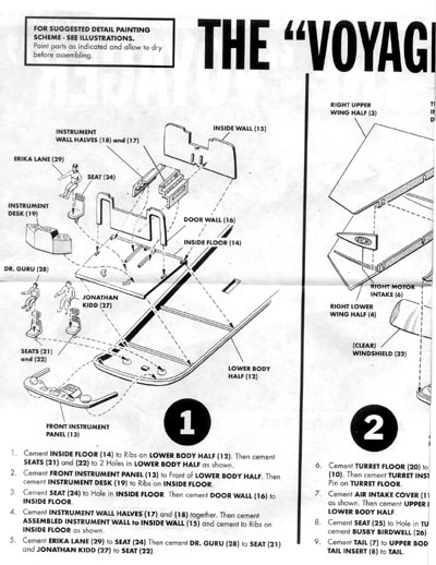 What You Get Enough with the history lesson, Grampa* - what's in the box? You get three baggies containing parts (2 sets of white plastic for the bulk of the craft, one set of clear that provides window, dome and 2-part base), a decal for the base, and instructions. Amongst the parts are four rather generic figures (one is recognizably a woman, but you wouldn't know Dr Guru by looking at anything but the part number). Judging from the size, they're about HO scale (smaller than 72d, larger than 96th) , so I'd guesstimate the kit is HO scale. Parts are crisply pressed, with no flash where it counts and nothing obvious as far as mold seams or ejector pin marks. Assembly instructions are in two steps, both of which are the exploded diagram style. There is a separate paint guide which calls for generic colors ("blue", "dark blue", etc.) |