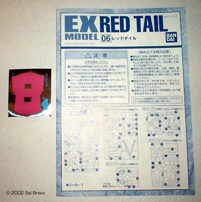 (Jet Black, Faye Valentine, Edward the hacker, and Ein the dog), as they race across the galaxy on daring adventures. They are bounty hunters struggling to survive in a universe that is a strange combination of past, present, and future. With each new bounty that they go after, new characters are introduced, and new cosmic landscapes are explored. The Red Tail is the personal ship of Faye Valentine and it is the second new Bandai limited-release kit (the first being Spike's Swordfish II) for this anime. Faye's Red Tail is a MONO Carrier with vertical take-off & landing capabilities and heavy armaments (MONO stands for Machine Operation Navigation of Outer space). A variety of equipment can be added in modular form to the ship, making it a flexible multi-purpose craft. In its basic configuration, Faye has it loaded with weaponry, both bought off the rack and customized with her own unique specs. Cowboy Bebop was, at the time of this writing, airing on Cartoon Network's Adult Swim on Saturday nights. The series is also available on video and DVD. What You Get Inside the box you'll find a small sheet of five self-adhesive stickers, the instructions pamphlet, two sprues of light-colored lavender plastic parts, two sprues of medium-gray plastic parts, one sprue of flesh-colored PVC parts and one sprue of clear plastic parts with a golden tint. Typical of today's Bandai kits, there is no flash on the parts that I could see, and the detail is above average. As for accuracy, heck, it looks like the ship from the TV show to me! The kit has a removable cockpit pod and sports dual "arms" with gatling guns and missile launchers. Although I have not done a test fit of the parts, if this kit is like all other modern Bandai kits, there should be little or no seam filling required. I'm glad that the clear parts are gold-tinted. Bandai must have had complains about the clear parts not being tinted on the Swordfish II kit. Three large figures of Spike, Vicious and Ed, plus one of Faye flying the ship, are provided on the PVC sprue. Since these do nothing for the kit, IMHO, I will probably discard these figures with exception of Faye's, which goes inside the MONO pod. The instructions leaflet is on black and white… uh, blue and white. It consists of seven steps (plus an optional one) with corresponding exploded diagrams. The text is all in Japanese characters although it should not present a problem, with the exception of the paint guide. Unless you can read Japanese characters, you will be using the box pictures as a painting reference. |