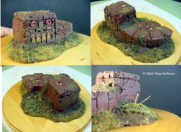 The excess was shaken off and left to dry. When the glue holding the dirt and grass was dry, the finished base was sealed with a flat acrylic spray and attached to the finished wood base with 5 minute epoxy. Little arrows were made from plastic rod, painted and attached to the back of the base. Finishing Up The figure was sealed with a light spray of flat acrylic, removed from the temporary wood base and epoxy secured it to the new base. After the flat acrylic, the very last item to receive paint was the idol, which was given a slightly red-tinted gold color. Conclusion This kit is suitable for any level of model builder and the extent of detailing and finishing is completely left up to the modeler. A total of 15 hours (not including paint drying time) was spent building and painting this figure model. |
