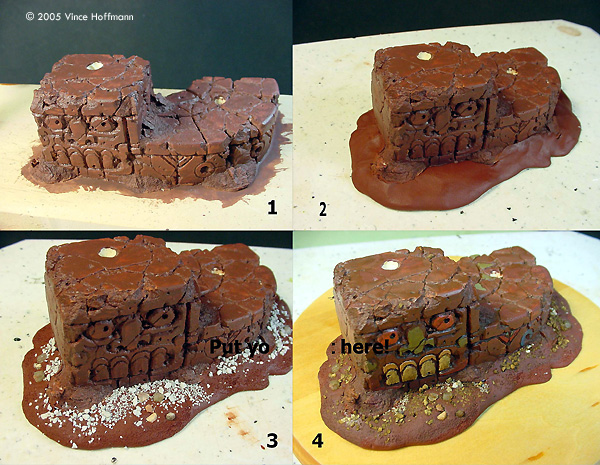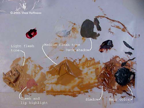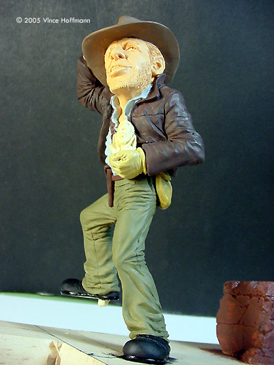 Face Painting After sitting for a two week drying time, the clothing was done and face painting began. First, the eyes were painted. A broad stripe of light blue was painted vertically onto each eye, followed by a tiny black stripe for the iris. Three basic colors were used to make the various flesh tones: white, yellow ochre and burnt sienna. Burnt umber was used for very dark shadows and crimson was used to slightly tint the flesh tones for a more pink appearance around the cheeks and lips. The three base colors were blended until a satisfactory flesh tone was achieved, then white and burnt sienna were added for light highlight and shadow colors. Starting with the eyes, upper and lower eyelids were outlined with the dark flesh color. This color was continued down around and under the nose. The same shadow was painted under the chin and cheeks and continued back to the ears and neck. Using the light flesh color, the eyebrows and forehead were painted. The top of the nose was painted as well as the cheeks up to the shadow line previously used to outline the lower eyelid. The chin and lips also get this light flesh color. All of the edges were blended and light highlights and dark shadows were accented with very small applications of white and burnt umber. A very small dab of crimson on the cheeks and lips gave the face some color, while a dark brown swatch for eyebrows and a thin black wash to bring out his teeth finished up the face. After the face had time to dry, hair was painted dark brown with black wash, and Indy's 5 o'clock shadow was dry brushed with grays and brown. The flesh tone was allowed to show through for a stubbly appearance. Painting and Finishing the Base I thought the base needed to be a bit larger Using Sculpy modeling clay; I extended the edges of the base and added miscellaneous rocks and gravel for texture. After about 1/2 hour in the oven, the base was ready for paint. Using the same type of oil paint that was used for the figure, extra thinner was added to raw sienna make a fluid mixture, and this was applied very liberally to the base. I allowed the wash to pool in all of the recesses and added a second application of Burnt Umber to make the shadows extra dark. After the initial wash dried, the stone face was painted and the whole thing lightly dry brushed with light brown. A viscous mixture of acrylic matte medium and water was then applied liberally to the base and grass flocking is sprinkled on, along with a sparing amount of dirt (sifted to remove bugs and twigs). Dried, crushed broccoli flower was used to make leafier ground cover. |