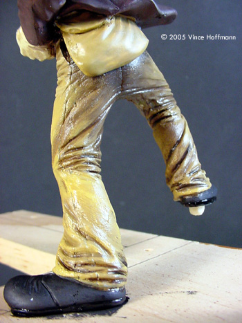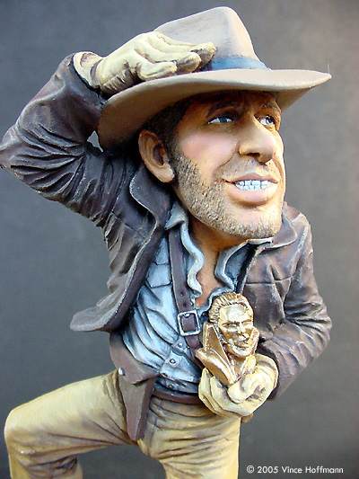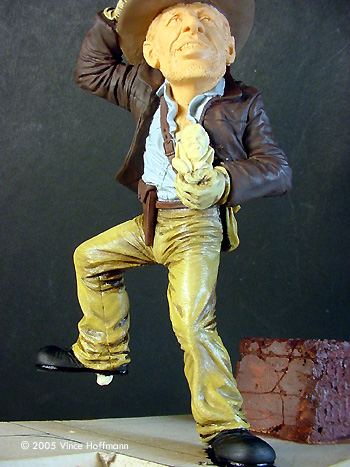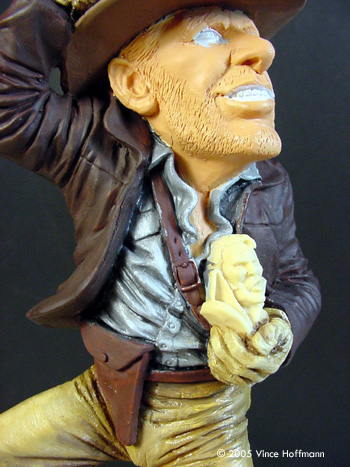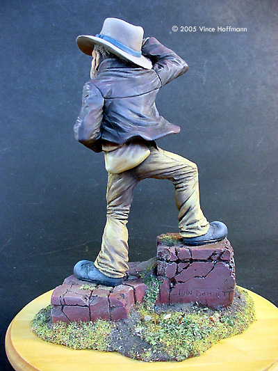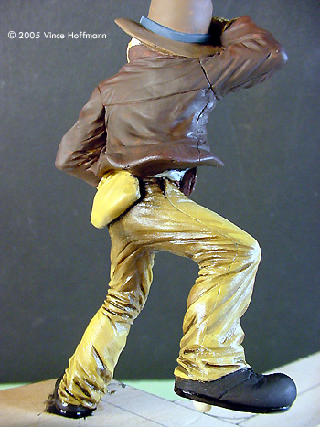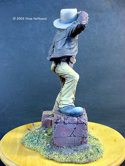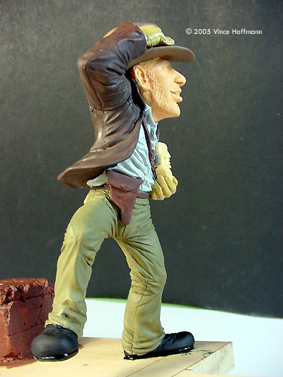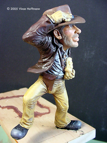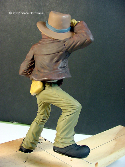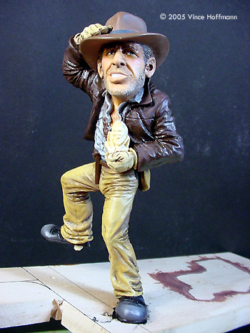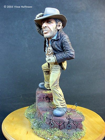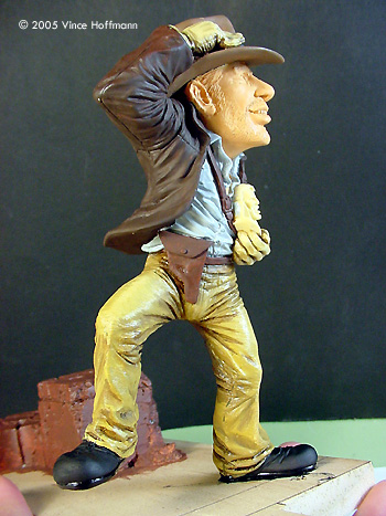 I picked up the display model, examined it closely and saw that the level of detail sculpted into this little figure was quite impressive! I had seen caricature sculpts before and the attention to detail would generally lack because of the subject matter, but not here. $15.00 later Indy found a new home. Overview As a nicely sculpted 120mm figure, this kit is an excellent opportunity to practice your painting skills. There is no need for instructions and painting is left to your imagination. Casting quality is good with minor seam lines visible down the arms and legs, and other seam lines cleverly hidden along natural breaks and texture changes. The detail is quite deep in some areas and small bubbles had to be popped out of many of these recesses. Cleanup and Assembly After the visible seam lines were cleaned up with a file and sandpaper, all of the parts were washed using Formula 409 and water. This very effectively removes all casting residue and finger oils. For ease in painting and to reduce handling, the figure and base were mounted on a 4"x8"x1/2" wood block with a short brass pin. The parts were then primed with lacquer based primer and set aside to dry. Base Colors The first paint to go on was acrylic, mixed to closely match the final color. No shadowing was done at this point; the objective here is to provide a flat layer of color to act as both an adherent for the oil paint to come, and a neutral color to which the shadows and highlights would be applied. After the facial flesh color dried, a very light grey base color was painted over the eyes and teeth. Painting From the Bottom Up I chose a heavy-handed approach to painting this figure; I wanted every shadow to be darker than normal, and every highlight to be lighter. It is a caricature after all! Windsor and Newton oil paints were used for the final colors, shadows and highlights. For Indy's pants, yellow ochre, white, raw umber and a touch of blue were blended to make a nice medium khaki color. For the shirt, white, black and a tiny touch of blue made a nice grey color. For the jacket, a leather tone was created by blending a small amount of raw umber with brown made from red, blue and yellow. Indy's hat is the same brown blend, with white added instead of raw umber to give it a bleached appearance. The glove colors are a lighter variation of the khaki used for the pants. From each of these colors, separate blends for the shades and highlights were created. Working from dark to light, the medium shadows were applied to the folds; highlights were applied to the high spots, and blended in the middle. Dark shadows and light highlights were added afterward to create more depth. Additionally, the undersides of the legs, arms, hat and jacket were given a forced perspective shadow treatment by making these areas typically darker than the surroundings. The intent here is to create a 60 degree sun direction (from the front) therefore, everything below and behind will be generally darker. Because paint was used to create the shadows and highlights, neither a wash nor a dry brush treatment was necessary to bring out the detail. |