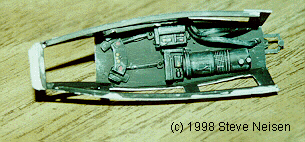 The Y-Wing was a two seater at first but the Rebel engineers removed the second seat to add a Hyperdrive unit . I used the engine details of the smaller X-Wing and a styrene box detailed with hoses and pipes to simulate the Hyperdrive unit behind the seat. On the top of the cockpit I added some hanging hoses (exhaust manifolds from a Ford pick-up kit) and styrene box details to simulate the the engineers cramming in the new Hyperdrive unit. Last but not least, I scribed all the panel lines on the front section, again using my blueprints as a guide. STEP 7 PAINTING AND FINAL DETAILING. I masked off the cockpit and gave the ship a overall coat of primer. This really highlights imperfections, crooked parts, misalignments and so forth. When satisfied I used Testors spray Gull Gray for the base coat of the body and Standard White for the front sections. I like to spray my ships in pristine condition first and then weather them. Once the paint dried I added all the remaining tubing and pipes (I painted them prior to attaching to the model). I used a candle flame to heat and bend the tubing to match my resource photos. These tubes were painted Gray and detailed with Rust. |