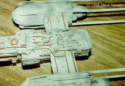 STEP 6 DETAILING THE EXTERIOR AND COCKPIT. This will probably take you the longest time to complete. Get out your spares box and junk kits because it's kit-bashing time. First make sure your Y-Wing has clean edges. Give it a quick coat of primer to show imperfections, then fill and sand as needed. |