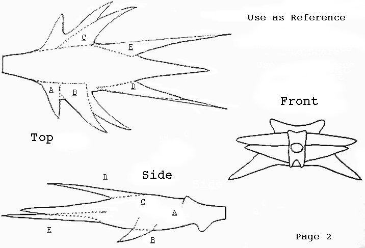By Kip Hart - © 1999 My latest project is a Shadow Fighter. Since I did not like the fact that the Revel StarFury had no companion, I decided that the Shadow Fighter would be perfect choice! While I do not consider myself to be a draftsman by any means, I felt that some sorts of drawings were in order to help construct the ship. As you can see from the drawings, I have broken down the ship into its major parts. While I know that the pieces, once assembled, do not look exactly like the ship, they are at least a starting point. There is a great deal of filling that need's to be done between the spines to get that smooth flow the body has. I should mention that anyone who attempts to build this model could contact me about obtaining more information on its construction. I have many more pictures than have been posted here, far too many to have placed here. They show the Fighter at different stages of its construction, and may shed some light on just " where " and " how" the areas between those spines should be filled. The basic body was carved from a block of balsa would, which I sealed with dope and sanded smooth. The nose protrusions were made by sticking clay to the body and molding it to their rough final shape. Since I planned to make a casting of the body out of resin to attach the spines to I did not bother to final shape the nose pieces. Then I made a mold for the body out of Plaster of Paris. A word of caution here. If you follow the way I make my molds then you should not immediately fill the molds with resin after you remove the body. Wait until they dry thoroughly, then spray a generous amount of mold release into them. After you remove the resin body from the mold you can sand the nose section to its final shape. Next come the spines. I developed a quick way to make these and once again inexpensive! I used clay again for the spine molds. The type of clay I used for this part is different than the clay used for the nose pieces, something called Plastalina Modeling clay. It is dry clay, as opposed to oil based clay like that used for the nose. I use the oil-based clay for the nose since you need something that will stick to the body - and the dry clay will not. The dry clay is used just for the molding process because it will not distort from the heat of the Resin curing, and generally "hold's it's own", so it makes for a good temporary mold! That, and it won't go sticking to every piece you make when you use it for a mold. What you do to make the spines is very simple. Say you were doing spine B. For my Fighter, spine B measured 1/2 in. thick. I rolled out a piece of clay flat to 1 inch thick. Then I cut out spine B from the plans I had printed out and lay it on the clay. Then, with an X-acto knife, I cut down through the clay, staying at a 90-degree angle all the way around the cut out. I then pulled up the clay "cut-out" of the spine. At this point, I lay the clay mold on a flat surface and with a flat object gently pushed on the clay so it lay flat on the table. Then I just filled in the clay with resin. After the resin set, I pulled the mold off the spine and saved it for the next one. I then used a razor saw to cut the spine down the middle, giving me two identical spines, one for each side of the model. From there I just repeat the process to make all the spines. When they're done, I shaped them to the desired pattern, doing each pair at the same time to be certain that they matched each other. After all those spines are shaped, I simply glued them to the body, paying close attention to getting all the angles right. Next came the fun part, filling in the between the spines. There's a lot of filling to get that "even" and "smooth" flow the body has. The main thing I used as filler is Bondo, since it dries quickly, sands easily and takes primer well. And most importantly, it's INEXPENSIVE. I bought a gallon of it some time ago and still have yet to use it all. After the filling, sanding, and primering of the model construction was finished. Then I simply used the same technique for the veins on the Fighter as I did for the BattleCrab. |