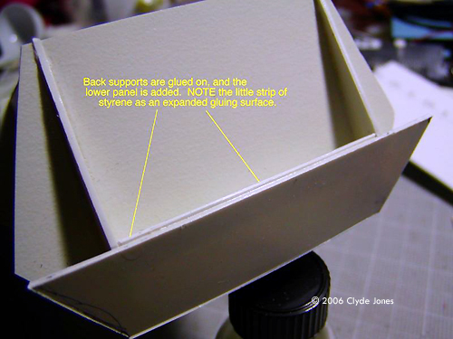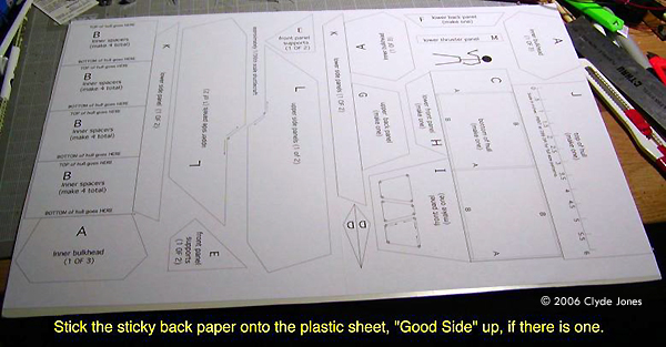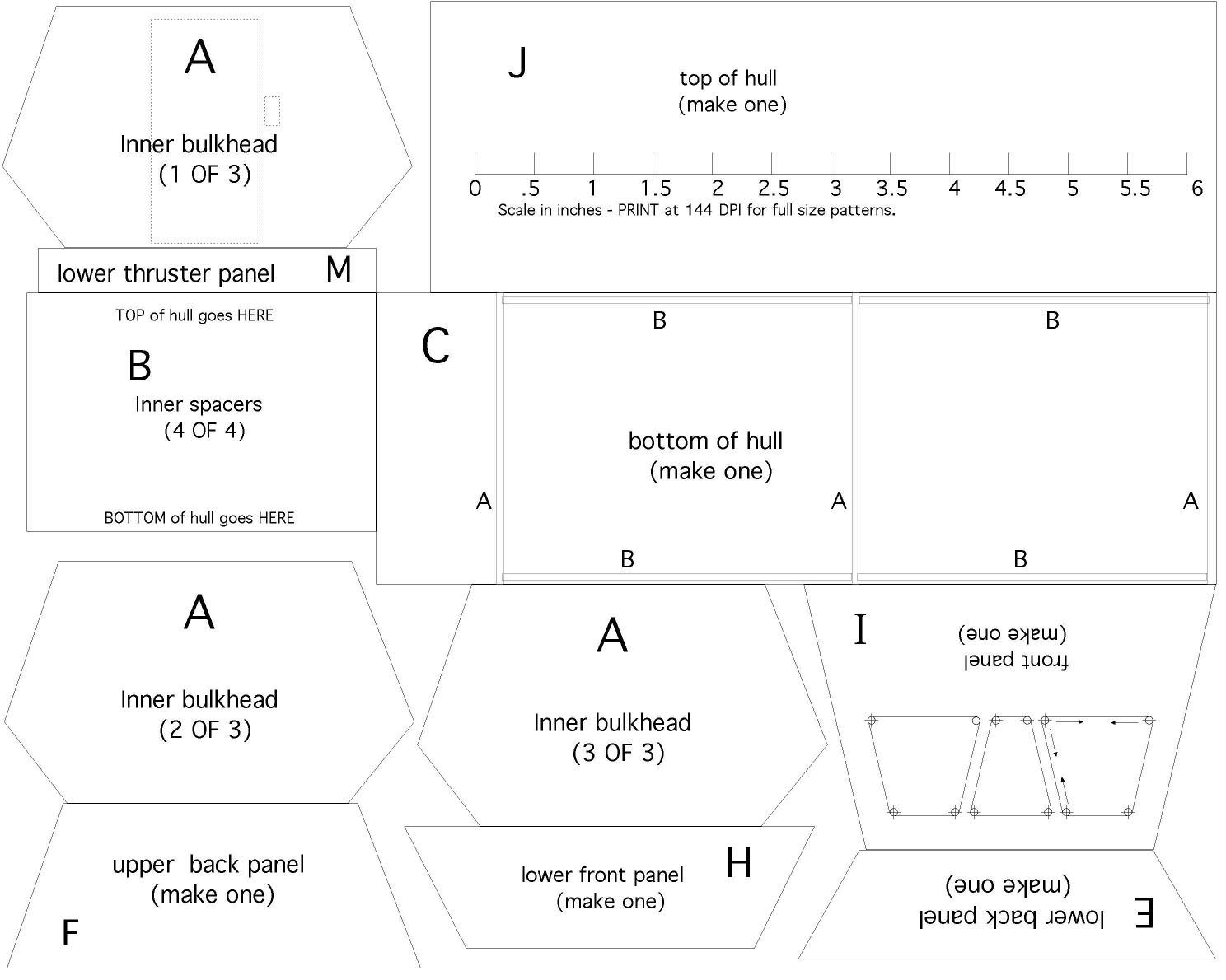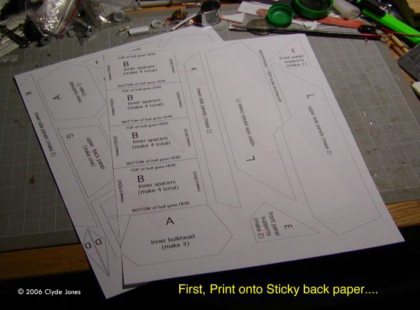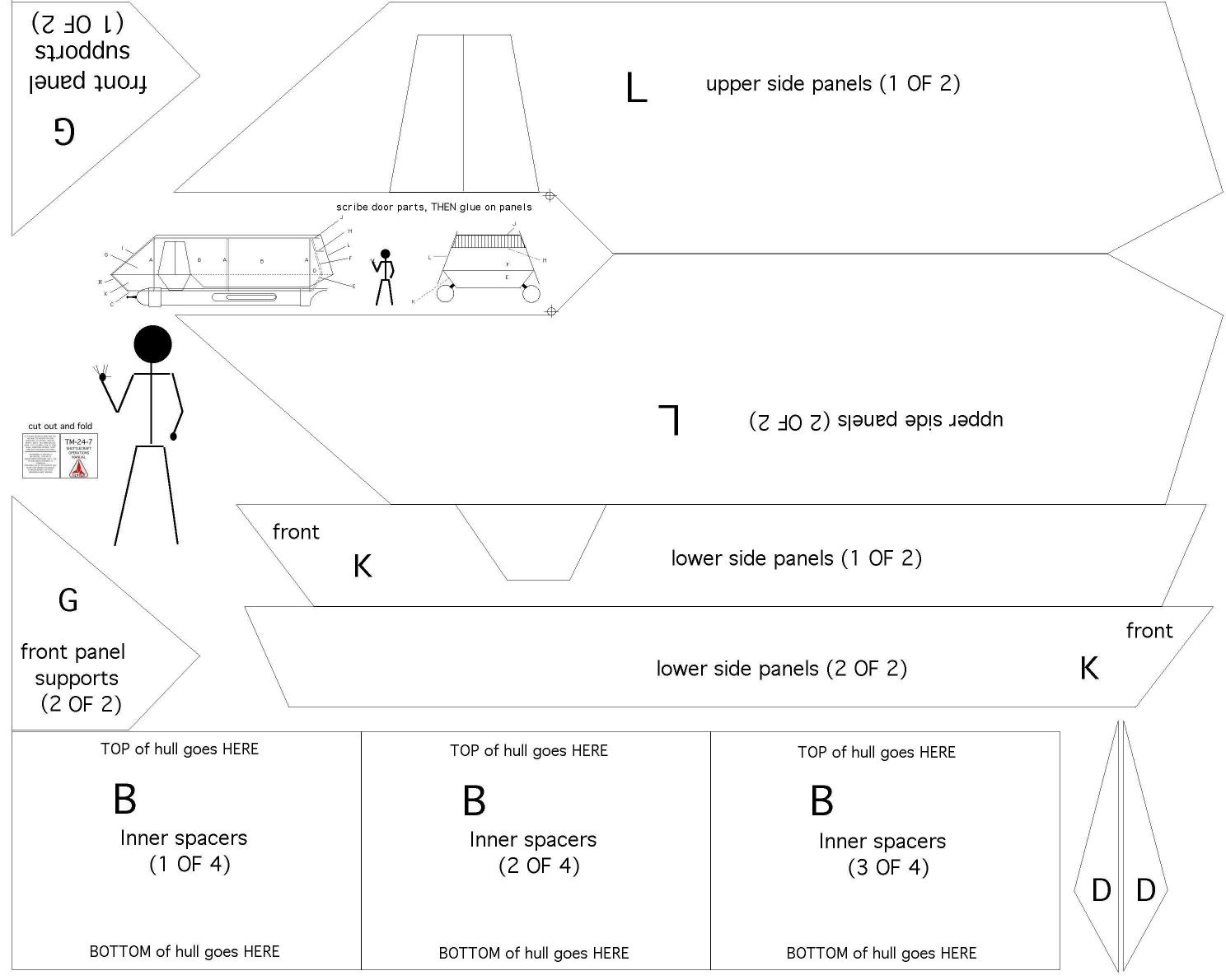 What you need, aside from a computer and printer, is a couple of sheets of AVERY or equivalent 8 1/2 x 11 inch self stick label stock, ( a full, un-die cut sheet, in other words) and a few square feet of styrene sheet stock, plus the usual model building tools. The label stock can come from the local office supply store. The styrene can come from the hobby shop (Evergreen) or hardware store - FOR SALE or OPEN HOUSE signs for instance. Personally, I like the OPEN HOUSE signs because they are made with thicker plastic. I also use a liquid cement like Tenax-7R or SC-125 or one of the Micro-Welds. When the joints are touching, glue is allowed to run into the joints, and a little pressure is applied the softened plastic at the joint squishes out a bit forming a very solid joint. On an injection molded kit, lots of work goes into making sure that all dimensions are precise and everything fits exactly. (Well, thats the theory anyway.) On a scratch build project like this, where each version is a one off model, things arent quite that precise. These plans are made as carefully as my time allows, and fiddled with to be pretty close. But not necessarily perfect. So you will have to do some fit in place work to make parts fit exactly. The bad news? You will have to do a good bit of sanding to final fit. The good news? Done carefully there are no visible joints - the finished model of mine is not only solid, its air tight. Small vent holes MUST be drilled in the void spaces or closed volumes of the model so solvent fumes can escape, rather than being stuck inside the model and softening it. Getting Started If you are familiar with the Scribe and POP method of cutting out parts, and have done some scratch building, the included HOW TO sheet should be all you need. If not... Lets start at the beginning. Please notice that the test model shown in the accompanying pictures was built with a different layout and numbering of the parts. These instructions and the downloadable patterns use the proper and matching numbers. The actual construction photos may show different part numbers. First, download the patterns. They are done in 288 DPI resolution meant to be printed on (US) standard 8 1/2 x 11 sheets of sticky back label stock. Please do so. Then actually stick the sheets to blank styrene sheet stock. This gives you a firmly attached set of patterns for cutting out the parts. Not to mention labeling them. The finished model is about 1/35 th scale as laid out. To change the scale, change the printing size. There is a printing size scale on one layout sheet that may help this. For instance, to make a 1/72 nd craft - reduce these plans by 50 % or there about. Of course, if you enlarge these printing patterns to say 1/24th scale, they will no longer fit on a standard sheet of paper. You will have to rearrange them to suit. Once you have these plans printed out you can use a sharp Xacto or OLFA knife to scribe around all the parts prior to popping them out. The Scribe and POP! technique is described in a separate article. On the first sheet, with the long parts like the upper and lower sides, you should drill TINY holes where there are small circles and cross hairs. That will give the later cuts and pops a good stopping place. Otherwise the popped separation may continue on into the part. Then make the long horizontal cuts separating the major sections. Continue those lines to the edges of the sheet for now so you can pop the long lines where parts adjoin first. Where there is another part that interrupts the long straight cuts, just stop between parts, and cut an in between joint so you can separate the parts. The end cuts can be made more easily if these long parts are already separated out. When cutting out the B parts, cut along the RIGHT end first, then the top and bottoms. Then separate the parts. Then cut around and pop out the smaller wedgie bits. Parts D and G can be filed or sanded to exact profile, or just popped since the dimensions are important, not the finish. If you wish to have an open door, or to have an inset door made with separate pieces, you should cut out the door openings when the side pieces are separate. If not, you can most easily scribe the doors at this point. On sheet two - with the front and back panels and hexagonal bulkheads, cutting may be easier if you follow this sequence. Theres a nice straight line between the C and J that can neatly separate out parts J A and M. Part B can be popped out next starting the first cut UP from the space between B and A along the LEFT edge of C to the edge of the sheet. Then scribe and pop off section B. Now part C can be scribed and popped off. The other panels on the sheet may take a little work but try removing E from I then remove H from A and then F from A. Finish separating all the panels, and sort by letter. Construction goes pretty much by alphabet here. Part C has a layout and assembly guide for the parts A and B printed on it. You can refer to this and glue the parts to the OTHER side of C where there is no sticky paper. |