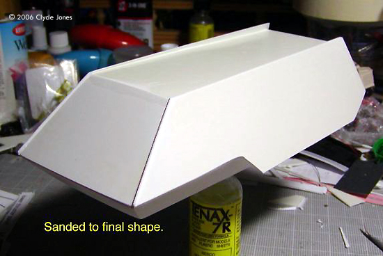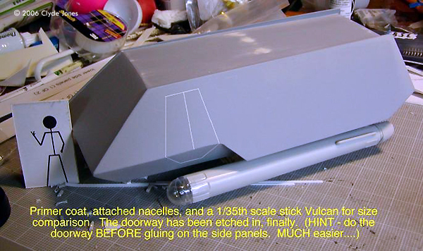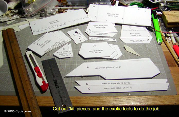 By Clyde 'Zog' Jones - images & text © 2006 This is a project to build a "Print, Cut, Glue" Trek type shuttlecraft NON-kit. It isnt an exact copy of any particular shuttlecraft, but is a generic TOS type. A classic shuttlecraft can be made by altering the parts and proportions, of course. Thats the fun of scratch building models. If you dont have a kit of what you want, you can build it anyway. This technique is applicable to just about any subject - and is a good way to turn a paper/card model into something we're (maybe) more familiar with. |