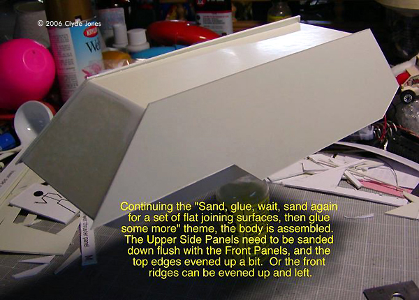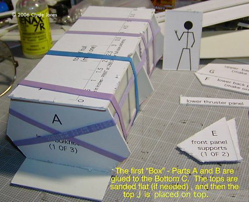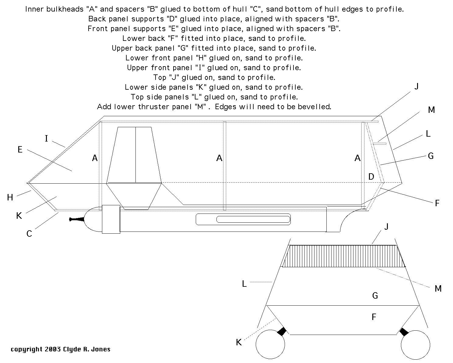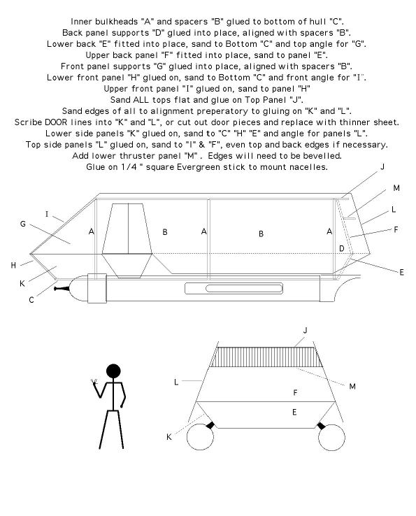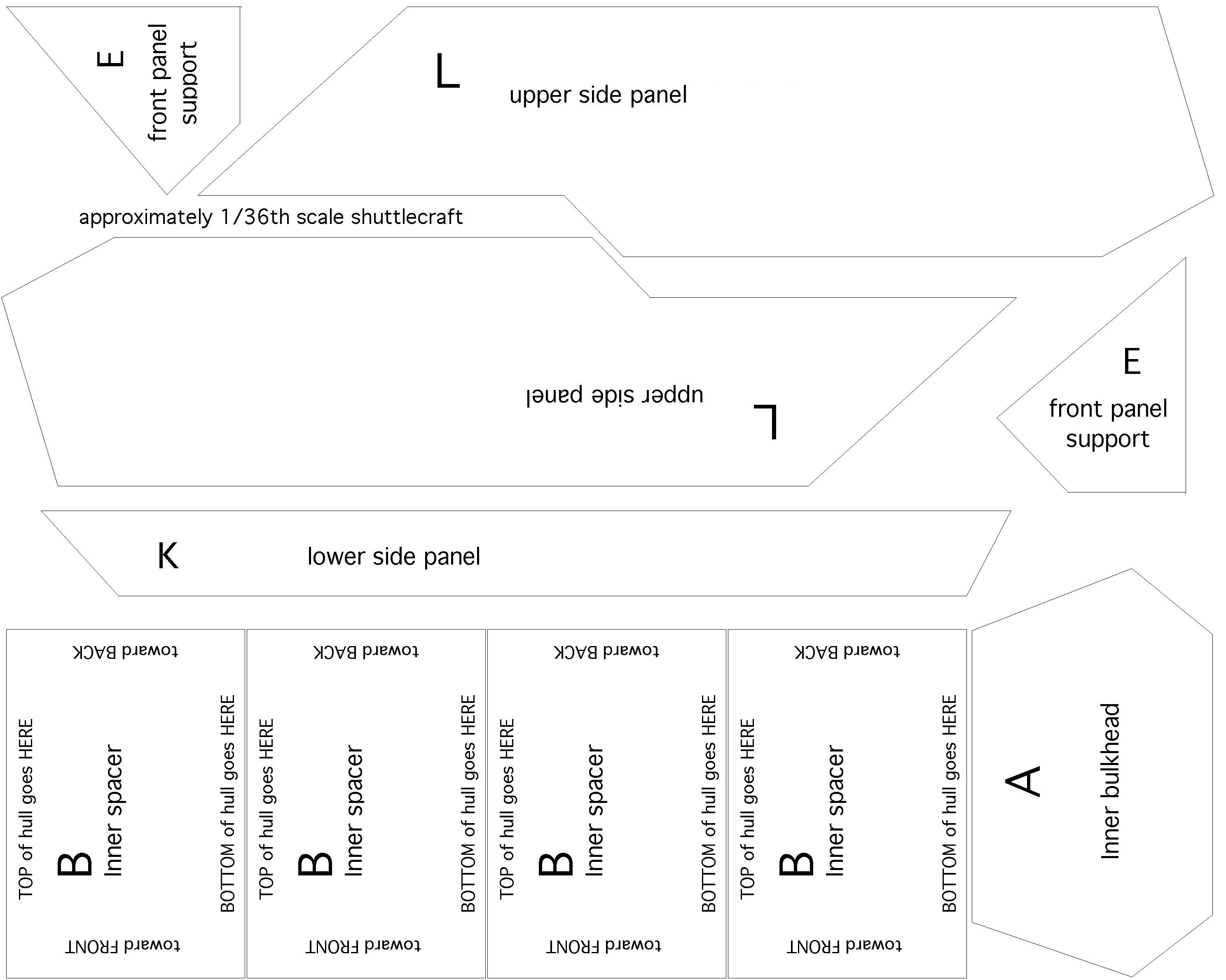 Construction Start with the A panel closest to the back of part C. Next to it goes two parts B - the combination of A and B joined together keeps them from folding flat onto C - handy that. REMOVE the sticky paper from the middle part A, and glue it to the first parts B. Thats a complete open topped box. Glue on two more parts B. Then glue on the last part A - the one with the door opening. If you are going to have an interior this door can be cut out BEFORE you start assembling. Please make sure that the parts B are centered on the keel of the ship as you go - that's part C. Some rubber bands may be carefully stretched around this assembly to help squish the joints together solidly, but make SURE that those rubber bands dont distort the basic shape. To be safe, once parts have begun to set and wont pull apart to easily you can take part J and SET it on top of the model and rubber band that in place to seat parts A and B firmly in place on C. Again, make sure that the basic form is not being distorted by the pressure of the rubber bands. Let this assembly set up solidly before going on to the next steps. Theoretically, all the edges of the A parts should form a couple of nice flat planes for the side pieces to glue to. Thats theory. Slight variations in cutting or gluing may keep these edges from forming one flat plane. NOW is the time to correct that. If you cit the parts A a bit wide so the lines show, you can tape a large piece of sand paper to a FLAT surface and gently sand all the edges of the A parts together so they DO form a flat surface. Be careful to keep the lines and proportions even so all the joining edges are straight. Also try and wet sand the edges. Styrene dust may not be too toxic but you dont need to breath it. You should now have a very solidly glued-together basic form of the ship. You may now peel off the paper on the remaining parts A. Add the parts D to the back of the ship, aligned with the B parts and centered on the back A wall, and let them dry. These parts will support the back panels of the shuttle. Once parts D are SOLIDLY set, you can attach part E - the lower back panel or bulkhead. FIRST carefully sand the back edge of C - the keel or bottom - so that it forms a flat plane with the lower parts of E. This part is intentionally a bit tall so that it can overlap the bottom of C and go past the peak of parts D. Once its COMPLETELY set sand it off even with the bottom of C and with the TOP SLOPE of D. For a larger gluing surface for part F, you can glue a strip of plastic stock between the C pieces at the top of piece E. Now attach part F overlapping the top of E and sticking up over both D and A. The sanding on E should make for a nice flat joint between the two parts. With liquid cement and a bit of pressure, it can form a virtually invisible squish joint. Once F has set COMPLETELY sand off the bottom flat with part E. Sanding while the joint is still soft will cause tearing and gouging of the softened styrene which will make a bad looking joint. Let em set. This process is repeated at the front of the craft with parts G H and I. First attach G and let it set. Then attach H with a bit of overlap on the peak of G and bottom of C. When thats REALLY dry and set, sand it off even with the bottom of C and the TOP slope of G. Attach I with a bit of overlap onto H and sticking up a bit over the top of G and let it set. Sand off the overlap with H. Remember - if you want open windows in the front on part I cut them first. For the window pattern given, first drill out the corners of the windows, then scribe the sides moving your knife FROM the corners TO the middles of the sides. This prevents the scriber or knife from going past the corners and making a bad POP separation. You may also want to make scribes from opposite corners crossing like an X and take out the window openings in pieces. If you are going to paint the windows or make a decal like I did, then you dont need to worry about that part. Now carefully sand all the tops flat and even (if they arent already) and attach J. Overlap part I on the front a bit and leave the rest on the back overlapping F to form the top of the Impulse Engine. Sand the front of J even with I. In spite of all the planning, figuring, careful cutting, and gluing, doing something with a hexagonal cross section isnt easy. So this is where the sand until it fits approach comes in handy. Parts E F H and I are deliberately a bit wide. Why? Because trying to figure the dimensions out with total accuracy drives me nuts and because no matter how well I calculate, reality has a way of disagreeing with me. Thats called engineering. Which leads to the Cut and Try approach. Or Sand until it Fits method. The sides of all the A pieces, and E F H I and J should form a set of flat planes so the side pieces will fit nice and flat. Usually, they dont so were back to our sheet of sand paper on a nice flat surface. Keeping an even pressure gently sand all the edges until each sides gluing surfaces are even and flat. I attached the parts K - Lower Side Panels - next, let em dry and then sanded em even with the keel C and with the slant of the top sections B and so on. Then added the Top Side Panels L. L should be left sticking up over the body of the shuttle for a bit of style and to echo the original shuttlecraft. The fronts of the L panels can similarly be left sticking out a bit. The Lower Thruster Panel M goes on last, sanding its ends to an angle matching the slant of parts L. Details, Details... The body is now pretty much finished. You can paint or decal in windows in the front of the craft if you havent already cut them out - if you wish inset windows or to add an interior. (If you do add an interior, that should go in before all the walls L and front panel go on.) I used a set of spare nacelles left over from another project on this ship. With this size of shuttle, the PL Enterprise nacelles work quite well. If you change the scale of your sh