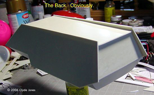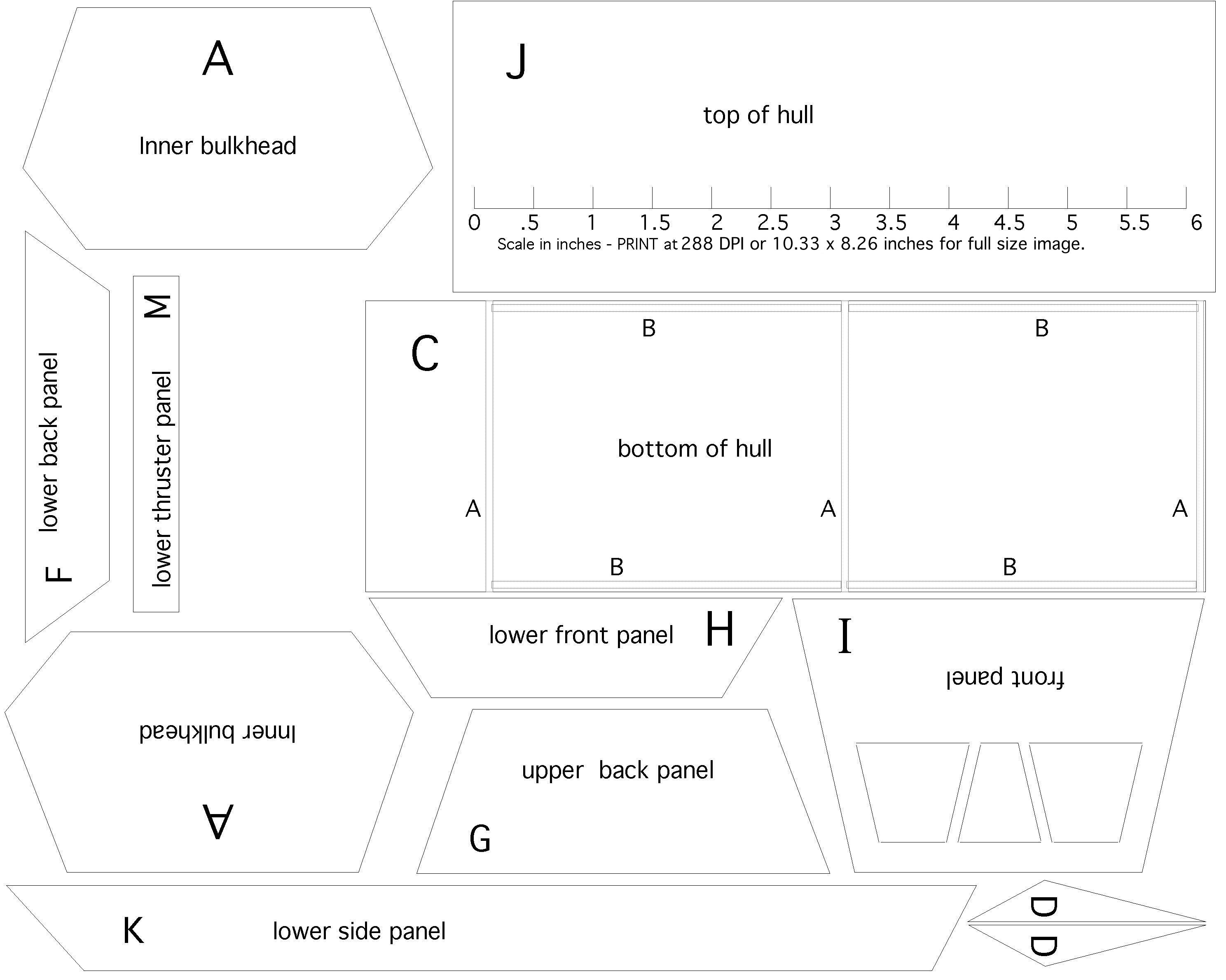 Instructions and Plans Image: Plans in PDF format (thanks to Frank Henriquez)Image: Plans, medium resolution, page 1 Image: Plans (med res) page 2 Image: Plans, page 1 (hi res) Image: Plans, page 2 (hi res) Image: Instructions (lo res - 72dpi) Image: Instructions (higher res, for printing) ^ First, print off the plans .... Image: .... then peel and stick on the styrene sheets. Image: Cut out the shapes ^ Basic assembly Image: Building up the sides Image: Close-up of the joint, step by step Image: Back detail Image: Lower back ^ Rough shape is now complete Image: Back, with out the thrusters Image: Hull is basically finsihed ^ Adding the nacelles Image: Adding detail ^ Structurally complete. Completed Model Image: Front/right viewImage: Right side Image: Right/rear |