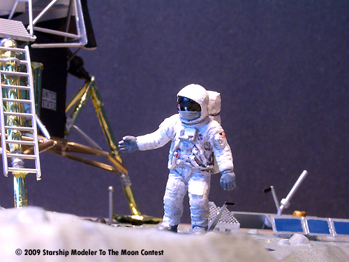 Assembly was straightforward, with little fit issues. The only serious seam requiring fixing was along the ascent stage, where the two main halves join. There were a few problems with the foil peeling back after a day or two, so I used Zap-a-gap to fix that. The kit was painted primarily by spray cans, Testors silver for the ascent stage, and Tamiya Gold and black for the exposed areas on the descent stage. The base was painted by misting on three shades of grey (or gray, depending on how you say that word) along with some drybrushing to bring out some details. Buzz and Neil were painted using Tamiya acrylics. I added reflections of the Moon, the flag, and the LM in their visors with said Tamiya paints. The "shadow" areas on the base were painted Tamiya Flat Black, as were areas of the LM.