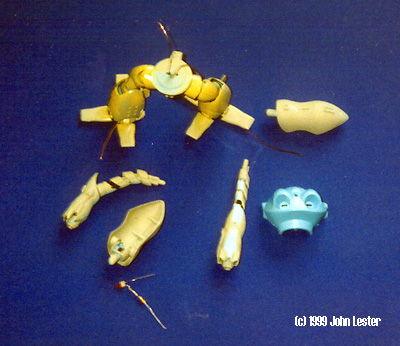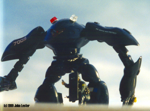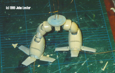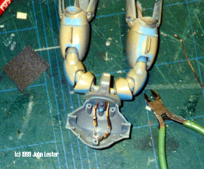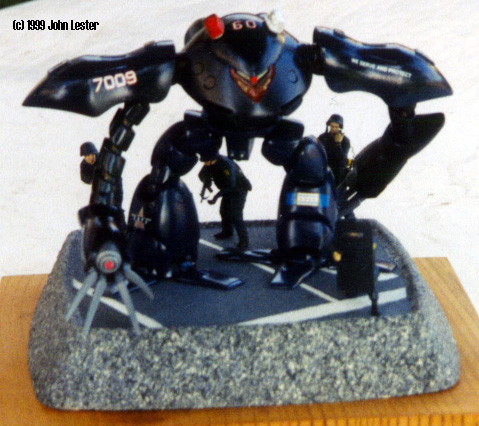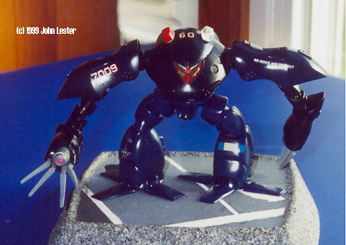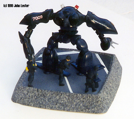 I have no idea where this robot (mech?) fits in the Gundam universe - nor do I much care. The box art lured my attention, and at 500 Yen (under $5 USD) the price was oh-so-right. Even if the kit turned out to be a stinker, it was worth the cost to me just to feed the spares box. The kit is not a stinker, though it is one the older in BanDai's Gundam line. This means fit and detail are merely exceptional, rather than the near-perfection of their current models. In many ways, this review could cover any one of their mech/robot kits. Quality and assembly are pretty much the same in every one I have built so far, anyway. Like all their other robots, this one is molded "in color": you get two sprues of baby blue parts (main body, arms and legs), one of bright orange (jet pack and missile container), one of translucent black ("fingers" and rocket) and one bright, clear pink (eye) - plus, of course, the polycaps that give the model much of it's posability. There are some 80 or so parts in all, not counting the polycaps. All were flash free, with no sinkholes or ejector pin marks to mar visible surfaces. Step-by-step pictorial instructions (with Japanese notes) are clear and easy to follow. Color photos provide paint references - if you want to do a baby blue and orange mech, that is. On the back of the instructions is what appears to be specs, vehicle "history", etc - all in Japanese. I decided early that the ease of building would allow me to do some extra with this model. I wanted to replace the plastic eye with a glowing red LED, to make it look as malevolent as the box art depiction. I also wanted to use the model in a diorama. One of my regular visits to the local hobby shop netted a set of DML SWAT figures for $2, which inspired me to do a police diorama (do I care the figures are 1/35, and the robot is "really" 1/144? Nope. With my magic wand, I made the Hygog 1/35 scale too). I found some Chicago police decals and stole the "flashers" from a 1/24 police car gathering dust in the closet, and I was set. I generally followed the assembly sequence in the instructions. Sub-assemblies were glued, seams fixed, and interior parts (especially on the arms) painted (black, in this case). Powering the LED was the only tricky part. I decided to run one wire through each leg, connecting them to a resistor and LED in the chest cavity. I used the wire wrap tool to join the resistor and LED, soldered the connections and wrapped them in a slice of electrician's tape, and superglued the LED into the eye hole. I then drilled out the necessary polycaps and plastic pieces so I could run a thin copper wire (22ga) up through the legs and torso, into the chest. That complete, all I needed to do was glue the lower body parts in place around the wires, then solder the wires to the LED assembly. After that, I closed up the chest cavity and dressed all seams. I tossed the orange parts into the parts bin for use on other projects. |