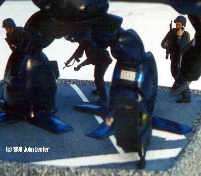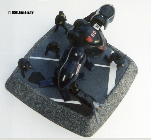 I hit upon cutting the two pieces apart, pouring resin in one, then placing the other on top of that to make a sort of hollow mold. Worked like a champ, except that I didn't use enough mold release and one tray wouldn't come unstuck from the resin shell. No worries - I just poured a little acetone on the offending Styrofoam - and in minutes it was gone. The resin shell was then sanded down so it sits level. The top was masked and the sides painted with Fleckstone faux granite spray paint. When that was dry and overcoated, I sprayed the top to look like a city street, complete with recently filled pothole. I then figured out where I wanted the robot to stand so I could drill holes through the base to connect the wires with the battery cap. All that was left was to finish the robot and glue everyone into position. The flashers were glued to the robot's head. Decals were then put on - numbers and bare minimum of text ("We Serve and Protect", "Emergency - Dial 9-1-1" and the Chicago Police CAPS program symbol). Once that was dry and overcoated with a clear semi-gloss, I glued the robot and figures in place. The final touch was to add a few scraps of paper to represent litter, as well as a square cut from a business card to represent a protester's sign being trodden on by the robot. All-in-all, it was a fun project - a chance to exercise the imagination while actually getting something built (for a change). I highly recommend these kits to anyone looking for a change of pace, or a quick build to restore your modeling fervor. |
