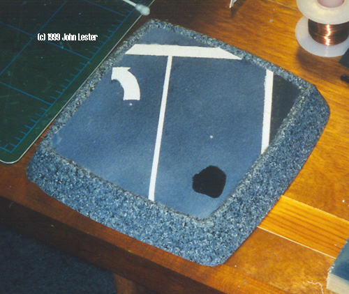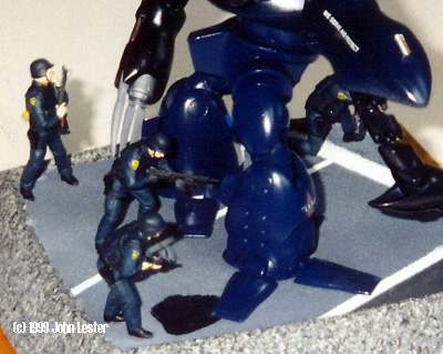 After masking off the eye, I primed the model with my standard cheap grey spray paint. This revealed a few more flaws to fix. Then came the "final" painting. I painted the area around the eye chrome silver, with British Crimson accents (unless noted, all paints used were Testor's Model Master enamels). The outer shell received several coats of Copenhagen Blue Metallic over a base of Blue Angel Blue, for a nice, deep glossy metallic finish that screams "COP!". While that was drying (gloss + metallic means longer dry time - I usually let the enamels cure for three-four days before handling), I turned my attention to the figures. DML figures are very finely molded and fit together almost as well as the robot did. The weapons they carry are also well done - but I wanted my SWAT guys to carry something beefier than an MP5, so I dug out M16's, M203 grenade launchers, and an M1170 shotgun from the parts bin - and if I could have found a bazooka or STINGER SAM, I'd have used them instead. I wanted to use heavy machine guns, but the figures' poses limited the size and configuration of the weapons they could carry .... and I didn't want to spend too much time cutting and repositioning arms, legs, etc. Once assembled, I used white glue to attach the figures to a piece of wood to make painting easier. I used several shades of blue for the clothing and flak vests, with semi-gloss black leather bits and holsters. Weapons were painted gunmetal and dry brushed silver. Flesh areas were painted .... well, flesh color, using Polly Scale Acrylic "Skin" with various brown/red/yellow washes to bring out detail and make them look less like zombies. After washing and drybrushing highlights, I affixed each figure's weapons and personal gear, and added a few details like slings made from slivers of paper and a microphone cord for the sergeant fashioned from very, very thin wire. I didn't want to hollow out a wooden base, so I looked around for something else I could use. A large Styrofoam take-out container was the right size and shape, but too flimsy. What to do, what to do .... |