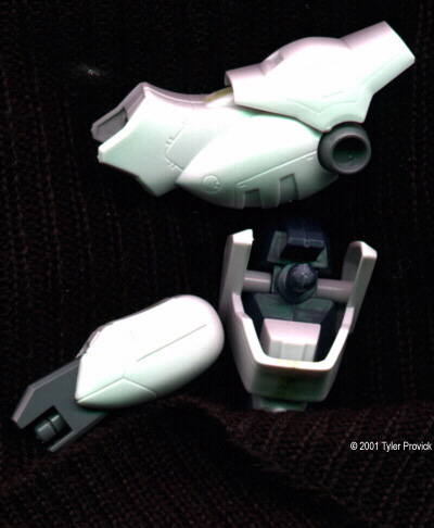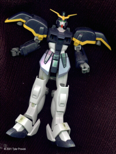 This is the first Bandai kit or review I've ever done, so please be patient with my unconventional views. It's also my first kit in a very long time. I've been painting wargaming miniatures (between 25 and 10mm) for the past four years. So if I'm doing something that sounds a little off, it probably is. I've been a big fan of DP9's Heavy Gears for a long time now. I was really in the mood to put something together that would take time and effort so I decided to get a model kit. I was also looking for mecha. Not only is Fusion Models' beautiful Kodiak OOP, it is almost too expensive for a first time learn-as-you-go project. My second choice is Gasaraki, however I didn't feel like searching far and wide and spending money to have a kit shipped to me. I also considered Votoms, but the only kit I saw which was reasonable to my situation (read: available in my province) was on eBay and I was (sadly) outbid. That left Gundam. Readily available from Wal-mart, made by Bandai, which I'd heard makes good kits. Still, I don't like the scale of their mecha. I've never been a fan of really big robots. I prefer something the size of Gasaraki, Votoms or Heavy Gear. Plus the colour scheme was too bright and toy-like for my preferences. After a bit more research I found that most of the models I've seen were not painted. That accounted for their plastic look. Since I want to paint something I decided it didn't matter. So off to the store to pick up the Gundam that appealed to me the most. Since they don't currently make a Gundam Wing 1/100 Heavyarms, I settled for Deathscythe. I bought him, brought him home, and immediately started putting him together. I'd already heard a lot of good things about Bandai kits, but taking a look inside the box really blew my mind. There were a lot of pieces - 147 to be exact. They were also molded in colour, which is a first for me. The thing that really surprised me was that some of the sprues were molded in different colours. Amazing! A couple of other things caught my attention immediately. The first was the chrome parts - too shiny in my opinion. After a bit of research, I soaked the pieces in a Comet and Water solution, stirred occasionally over 2 hours. Comet doesn't fully dissolve in water. It would settle on the sprue and bottom of the sink and needed to be stirred occasionally. I probably should have worn gloves, but I've washed enough bathrooms with the stuff I didn't think it was necessary. Still, I would recommend gloves, just to be safe. Anyway, after the soak and rinse the chrome was fully removed, without need for scrubbing. I did scrub them, because this is the first time I used this technique, and didn't realize that the chrome would just disappear until I became tired of scrubbing and let them sit. Now I have a perfectly flat black sprue of parts I can paint whatever colour I want. This step was important, because during my research I discovered you can't paint over the chrome easily. The other thing that caught my attention was the clear green parts. They were very flexible, and will probably not hold paint very well. Since I want to paint them I'll probably have to find a way later. I might consider casting my own parts, since it's not the transparency I'm looking for. One thing modelers will notice about this kit is the almost complete lack of flash and seam lines. I think Bandai must change their molds every 5 kits or something. Of well, I'll not complain. What I will complain about is the whole snap-fit concept. Bandai does it very well, with minimal seam lines (all things considered with snap-fit) so that the model can be assembled very quickly and look good. I planned on gluing this, and spending a lot of time making sure there were no seam lines. That's one of the reasons I wanted this kit. Before you begin building you must remember - if you want to test fit parts, you will need to be careful, as some parts don't come apart easily due to the snap-fit. |