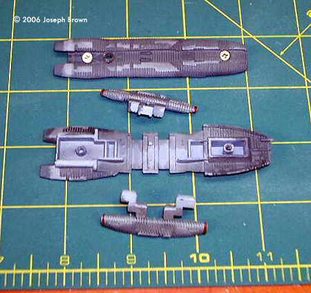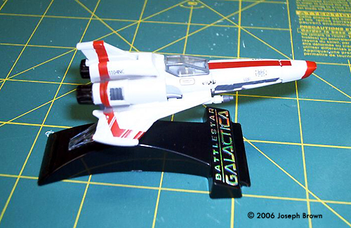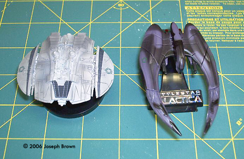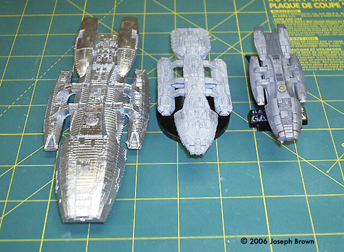 ^ The first three releases ^ The mighty Galactica Image: Modifying the landing bays, Step 1: take apart Image: Step 2: separate Image: Step 3: trim these areas Image: Step 4: test fit Image: Done Image: Galactica, from the front Image: With the Bergstrom gamining mini Image: With the Konami (TOS) Galactica Image: With Alliance's kit and Konami ^ New Raider Image: Starboard side Image: With the Konami Raider Image: Another look ^ New Viper Image: With the Konami Viper |