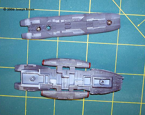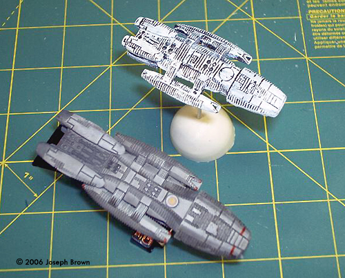 The new Battlestar Galactica TV series is a refreshing reinvention of the 1970s story, and some of the most exquisitely done television that I have seen in a long time. And, it's nice to see some product support from Hasbro! Something worth noting: the Mark II Viper that you get is in the package for the Mark VII, making me wonder who messed up where. The short 'history' text on the back seems to be indicating the newer Viper as well The Viper does have retractable landing gear that works, but it looks so much cooler on the stand that I'm probably not going to be using the gear much. What You Get Secure in their individual armored packages, you get the Galactica, the new Raider, and the Viper (Since Joe wrote this, the Viper Mk VII, Raptor and Colonial One have been added to the line- Ed.). Each of them has a simple but functional stand. The mounting hole for the Galactica is way in the rear, near the beginning of the engine pods. Why there? When you see the disassembled view, you will observe that the more logical center area is taken up by the way the hanger pods retainers are installed. Could they have done a better job? Perhaps, but there is not much room to play with there. Hard-core gamers (or modelers) can easily solve this issue with a simple modification. As you can see, t6he scale of these is "mixed". If the 'real' Galactica is 1438.5m, and the mini is 94mm, the resulting scale is: 1/15,303. Similiarly. the Viper Mk II is 8.4m, the mini is 75mm, and resulting scale is 1/112. The Raider is 8.94m, the mini is 81mm, and the resulting scale is 1/110. I've included some comparison images of the ships with the applicable Konami 'candy-toy' ships that came out in 2005. While I did not whip out my micrometer, plainly the sizes are very close to matching. In other words, they all look good on the shelf (or gaming table) together. And, because someone is sure to ask, I also included shots of Studio Bergstrom's gaming miniature of the new Galactica and the Alliance's resin Galactica. Assembly and Finish Assembly doesn't really apply here. You take the toys from their packaging and set them on their stands. Done. Many people have commented that the hanger pods on the Galactica don't want to extend fully, and that is true. But, an easy fix is to flip the ship over, unscrew the two Phillips screws, and then carefully shave away at the parts that function as stops. I carved away almost 2 mm of the applicable areas on mine, and that seems to have essentially solved this issue. (See the circled areas of the ship's innards.) Just reassemble the ship, and test to see if you are happy. Overall, the paint scheme is acceptable. If you don't care for it, modification would be easy. Enamel or acrylic paints can be used to create any color variations that you desire. I'll probably try toning down the purples on the Raider first! Conclusions Perfect? No. Great value for the price? You betcha! Run out and buy some, or order some online. And maybe, just maybe, we'll see more of these cool toys. Like a Basestar, Heavy Raider, a Galactica Crew Shuttle, and then there is the Blackbird and the whole Ragtag Fleet . . .Recommended! |