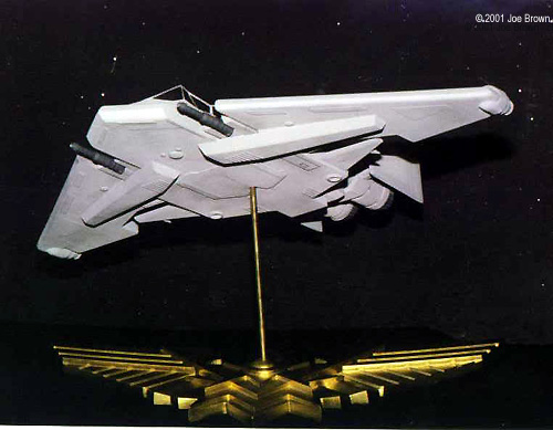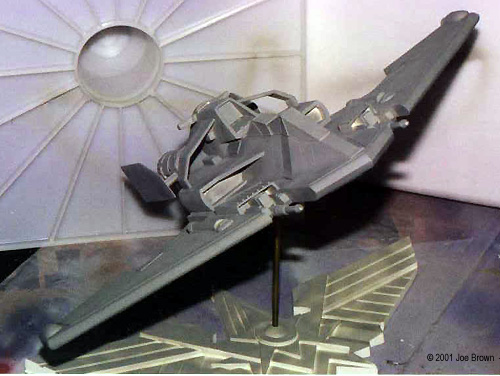 Gemini Productions, Inc. had a booth at Wonderfest 2000, and after looking at this kit all that weekend, I bought it on Sunday shortly before I headed home. This was quite a bit for me to spend on a single model kit, but I had tried scratchbuilding this one and just wasn't getting anywhere. Also, their display model was simply gorgeous! And in 1/48 scale, it's BIG! WHAT YOU GET The kit consists of 28 resin pieces; one is a clear acrylic support rod, and the other 27 are very high quality white resin. The entire kit came in a study cardboard carrying case, and other than the fuselage, all parts were individually sealed into their own plastic pouches. There were virtually no resin pits or bubbles (that means fewer than 10!) and while there was minor mold-seam line clean-up to do, it was very minor. I was able to wash clean all the parts of any mold release and finish the seam removal all in one evening (about 1 hour actual working time). I found the resin to be of medium hardness. It's quite firm and stable, but it can be carved or sanded with minimum effort. The two biggest pieces are the main body (or fuselage) of the fighter itself, and the beautiful "Fleet" base. The base looks like the wings that the Navy uniforms sport in the movie and is very nice. It's a goodly sized piece at 7 & 9/16 by 15 & 3/8 inches, and it is wide and weighty enough to support the assembled fighter. BUILDING IT I have never before had the pleasure of getting a kit which virtually falls together right out of the box. I was delighted! This fighter can easily be assembled in a single sitting. But, I would suggest taking one's time with it to simply enjoy building a quality kit. The assembly instructions/painting guide are on a double-sided, color-printed page, and are very clear and explicit for parts placement. Sounds minimal? It is, but it's almost overkill--even with 28 parts this kit is a breeze to assemble! There were three spots where I used MagicSculp putty to hide join seams, and each of those was because I had been a little too heavy handed with sandpaper. When I purchased the kit, parts were included for two main engine intakes; unfortunately, they were both for the port-side engine! And you can't just reverse them. I know, because that's the first thing I tried! So I e-mailed the company and explained my problem. They promised a free replacement, and when I received it, I discovered that they had tossed in a few freebies for my trouble! PAINTING I used the photos that D. Dymerski provided in Amazing Figure Modeler #17, and also on the Starship Modeler Hardware Reference page, in the Starship Troopers sections. There are also some great black and white photos in issue #27 of SciFi & Fantasy Modeler. The hardest part of painting this model is that fact that it is so big! I used ModelMaster Acrylic paints, mainly airbrushing Light Gull Grey and darkened Neutral Gray for contrasting panels. I sprayed Flat White into the centers of some panels to attempt a soft color contrast. It's a very subtle effect, but I like it. The anti-glare panel in front of the cockpit, two areas of the forward wing, and the edges of the engine intakes were all sprayed with Tamiya Red to give the fighter a bit of color. The cockpit itself was inked with a Uniball Microfine pen Since this was done over the grey, there was a neat off-black look to it when I was finished. The base was painted gold (nice and simple so as not distract from the fighter). For actual mounting, I used two diameters of brass tube that fit inside one another--a short wider piece in the base, with the slightly narrower tube going up as the support, and another of the wider piece glued into the fighter. I drilled a hole to accommodate setting the second wider piece into the fighter at its center of gravity; and placed the fighter at an upward angle, tilted to one side. This has become a habit with me, since it allows showing most ship models at a more dynamic angle. CONCLUSION I will (eventually) remove the solid resin cockpit and build a clear one; I already purchased two resin ACES II ejection seats for the flight crew in 1/48 scale. I'll have to do some creative fitting to shoehorn them into the molded-in cockpit tubs. But, since those are already there, that should make adding a visible cockpit even easier. This is one of those resin kits that I am happy to advise anyone who has the cash to buy it to go ahead and buy--it's a real winner! |
