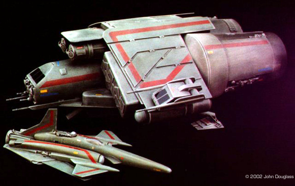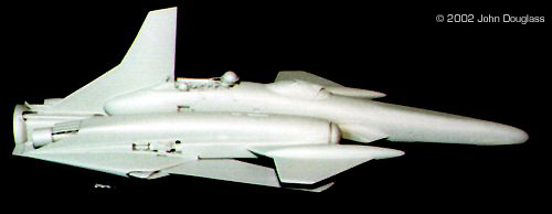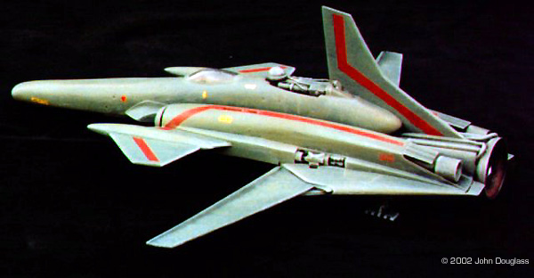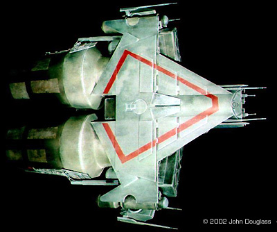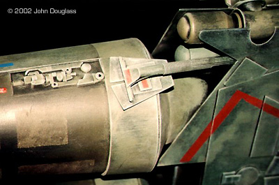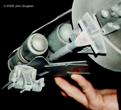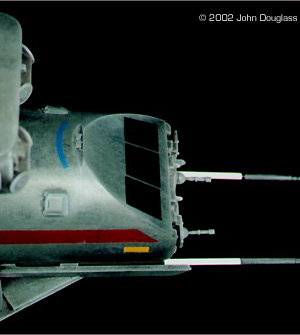 | By John Douglass - images & text © 2002 I was commissioned to build two spacecraft miniatures for a film project. No sketches or plans were presented. Instead I was given a few design constraints. Both ships had to have landing gear as they were both to spend some time in a hangar, but having movable landing gear would far exceed the budget, so the gear need only be two-position. The guns were to be similarly positionable instead of remote-controlled. |