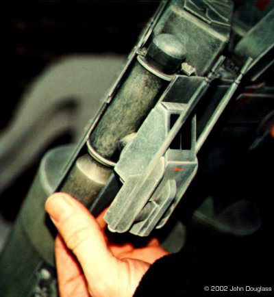 Destroyer The destroyer was much more challenging to build. I started with a fairly standard "h" design - two cones coming back from a triangular central hull, with a cylinder in front. Several years ago I bought some large plastic cocktail shakers that I thought at the time might make good engines. I started with them and, although I used them and I think they contribute to the ship's distinctive shape, they proved to be a bit of a problem both because they were so large and because they were made of rather thick, hence, heavy plastic. As the ship was supposed to be customized by its crew, the landing gear could not be part of the replaced engines, but had to attach to the central hull. But the weight of the engines shifted the center of gravity abaft of the central hull. That is, simple legs extending straight down from the back of the main fuselage would still be too far forward to keep the ship from leaning back on the engines. I could have added weight to the front of the ship but I decided not to because then I would have to beef-up both the legs and the part of the fuslage where the in-flight mounting point was. Instead, I did two things. First, I shortened the engine cones by slicing two lines, one an inch from the base, and parallel to it, another an inch or so from the top. Both slices extended about half-way around each engine, but on different sides. I connected the slices lengthwise, thus separating each engine cone into to "L" shapes. Putting the smaller-diameter end into the larger effectively truncated each cone, shifting the center of balabnce forward slightly, while adding an aesthetic ledge in several areas and a square area ripe for detailing. The second thing I did to keep the ship from tipping back was, obviously, angle the legs back. That is why the main geer sticks more back than down. To get the gear back, yet have it strong enough to survive filming, I used legs made of disposable razors, just like the Brit SFX artist Martin Bower (The right-center ship in his "logo". I remember it being featured in a modeling magazine many years ago). The legs have lexan ("flexible plexiglas") shafts inside, which in turn stick into the fuselage either straight-back for in-flight, or angled upwards for landing. The two-position effect I accomplished by drilling one hole for each shaft in the aft, visible bulkhead, and two holes each in an interior bulkhead, one hole above the other. The lexan shafts have just enough give in them to affect a slight sag when the ship lands. The front landing gear was at least as much trouble, but for entirely different reasons. It turned out I was supposed to provide this ship earlier than I'd planned so that the live-action sets could be built to mimic the landing gear. Thus, access to the ship's interior was to be near the front landing gear. So I built something with a ramp, even though an elevator would have been easier for me to build, but much harder for the set-builders. The ramp has a notch that fits into a slot in the lower fuselage. Flanking the slot are two square tubes into which the landing gear are placed. The legs have stops on them that keep them from extending all the way into the ship. Behind the legs is a hole for the 3/8" screw that is in turn attached to a stand. The hole leads to a large, shape-filling balsa-wood block. Its the only mounting point I planned on, and it anticipated belated instructions to include it. The balsa wood adds miniscule weight, yet allows a snug fit on any threaded armature. The turrets were a challenge, and not just because they went through two revisions. The initial design, long guns, but with no gunner compartment, were why the turret mounts rotate from the bottom of the fuselage, out, then up. I had wanted the guns to "fold-up" during landing. But, as the customer reiterated a desire for gunners, I built to manned turrets, based very loosely on those on the Aliens' Sulaco. |