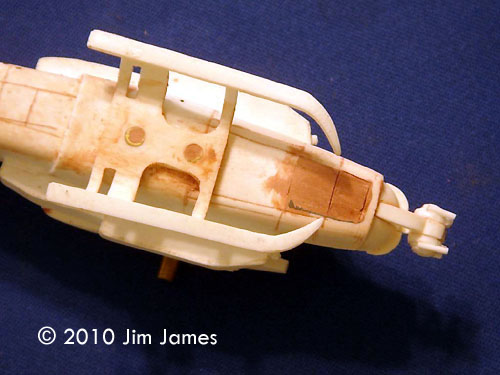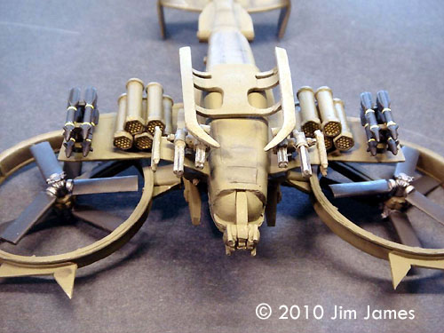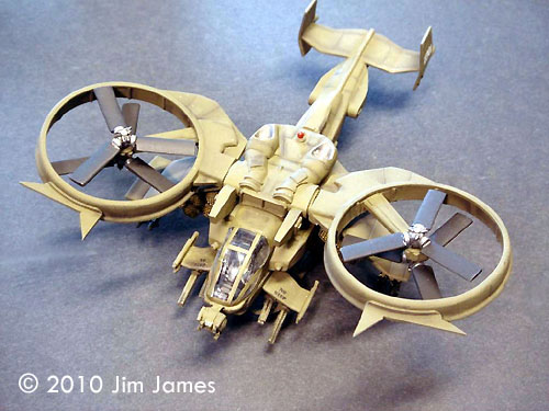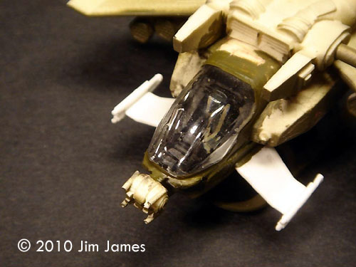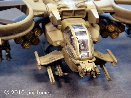 Minor Modifications I made a few changes to strengthen and improve the model: Weaponry The weaponry on the Scorpion is what makes the craft distinctive. Some pieces like the Gatling guns under the forward winglets and the nose turret are really nice. The Hellfire missiles and racks fall into the OK category and I replaced both the missiles and rack with AH-64 parts. The FFAR pods are OK but the pylon arrangement is confusing. The instructions call for the pods with long pylons to be glued to the wings. There are already short pylons molded into the wings and there's no indication if they are a guide or a base to glue the AGM pylon to. Either way, the FFAR pods would end up hanging too low. Lining up the pods is a nightmare. The first row of three is staggered and the second row of two is staggered so the front of those pods falls between the staggering of the bottom three. Lining the pods up with the stagger and making sure they a consistently spaced and parallel to each other is difficult. I ended up rebuilding the pods in styrene just to make gluing them together easier. I also made black decals to detail the front of each FFAR pod. This allowed me to paint the missile tip area with Zinc Chromate and mask off each missile and the inside of the tube front with the decal. The mounts for the Gatling guns on the front winglets need to be trimmed drastically to prevent the guns scraping on the ground (they default to the pointing down position). Decals The kit comes with white tail numbers and alternate tail numbers just in case you want to build a fleet. I added two yellow stripes around each Hellfire, a black “No Step” on each of the smaller front winglets, the fronts to FFAR pods and some thin white lines to the nose gun. The Cockpit The one really weak part of this kit is the cockpit canopy. You get two clear vacuuform canopies but no resin plug. Cutting them out can be a hit or miss operation and, frankly, I can never seem to get the edges right. The frame detail is very soft and when compared to screen caps, the frames are about twice as wide as they should be. There is very little that can be done about it and because the frame edges are so soft, it makes masking difficult. Given that fitting a vacuuform canopy is a less that joyful task, I detailed the cockpit and glued the canopy in place. After filling the seam between fuselage and canopy with white glue and Mr. Surfacer, I masked the whole canopy, painted the model and detailed the frame work with painted decal. Paint What can I say; it's Olive Drab all over. You can paint the Hellfires black and the rotors black with silver (steel) hubs. I used a fine sponge tipped brush (eye shadow applicator) and “painted” the panel lines a very dark green pastel mix. Using the sponge tip creates a dark center line with a bleed on either side. With all the under wing stores, it's best to paint the wing roots and first row of FFAR pods before adding the second row. Display I plan to use a simple base with floor modeled on a screen cap from the movie. In spite of the additional weight, the Gunship does not sit evenly on its skids (it looks tail heavy). I may add some ground clutter - tools kits, fueling pipes, electrical cables, etc. - and use one of those tubes (plugged in below the tail boom) to support the tail. Overall It really is pretty nice model despite its challenges and because of its unique design and scale; it's a nice addition to my collection. |