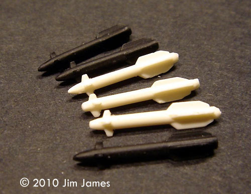 ^ The canopy frames are painted decal. Image: Italieri (black) missiles as compared to the kit's Image: Brass tube replaces the mounting pins Image: Canopy in place. Note the sparse cockpit detail and the soft canopy frames Image: Added weight covered by putty Image: The very soft FFAR pod ^ All done Image: Top/rear view Image: Underneath |