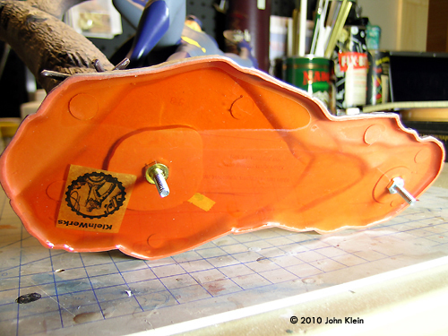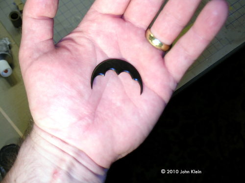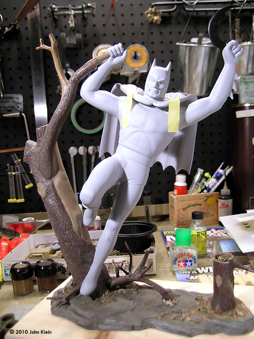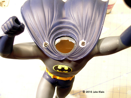 Image: Starting point - frome here .... ^ ... to here. Image: New batarang Image: Belt and batarang Image: Securing the cape Image: Primed Image: Test fit Image: This model is not going anywhere .... Image: Completed -closeup Image: Left side Image: Looking up |