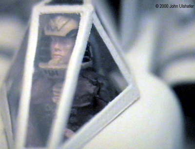 | Image: Cockpit CRT display ^ Three views of the finished cockpit, in place. ^ The instructions also show how and where to place a detail panel on the nose.Image: Close-up of the completed pilot figure ^ Three views of the completed pilot figure.Image: Looking down into the cockpit. |