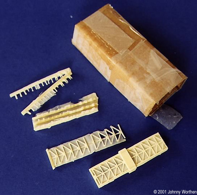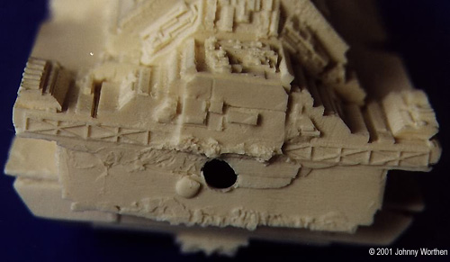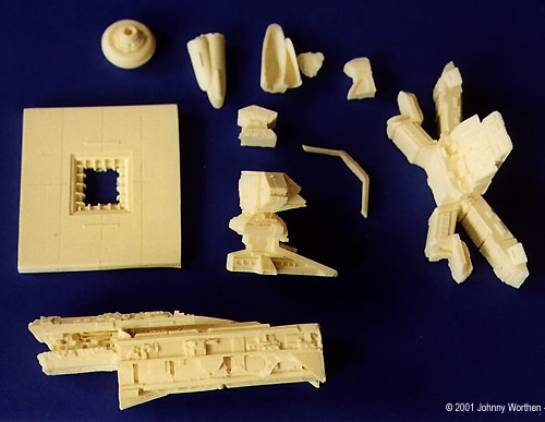 The resin itself, I'm sorry to say, seems pretty brittle to me. If you read fear in these words, you're right. I'm going to have to clean up these messy pieces with a gentleness and kindness I've never known (alcoholic family.) The hull parts will need to be deeply drilled and pinned for support. I pray that I don't offend any of the smaller parts with my sanding lest they crumble like a potato chip. The availability of replacement parts is questionable. The instructions I finally received from Monsters in Motion are barely adequate but will suffice. However, outside of the box art, there's no indication for painting or other color details. (Johnny, try looking at our Starship Troopers' Studio Model Page - right here. - Ed.)A decal sheet would have been so nice. There's not a lot of lettering on the ship, but there is some and for this kind of money... There are a couple of pieces that just cry out to be metal or photeteched or steel or styrene or wood or something other than resin. There's the gantry which is cast well for resin with open lattice work (after you cut them out), but I know most everyone who gets this kit and keeps it will consider reworking this part with brass or something. There's also a little antenna array with very fine mesh work which is also done very well for resin, but it too screams for another medium. My piece has a corner nicked out of it. I'll live, but for how long? The guns which come on a little resin sprue should also be replaced with pins or wire. Not a hard conversion, but practically required. It came with no stand, so you can either hang it from you ceiling with 50 pound test or create a base - more conversion.Conclusions This kit is not for the novice, the faint of heart, aggressive, impatient, poor, unemployed or Nazi modeler (Nazi's just suck and shouldn't be allowed to model starships at all). When I ordered this kit, it was the only show in town. I hate to say it, but I wish I'd waited for the reputable Erasmus model. The Hoto kit is highly detailed and when finished will be an awesome piece - probably win awards. I don't blame the over-worked people at Monsters in Motion for more than not responding faster to my emails. The problems were with quality control at the manufacturer. Even with the great detail and accuracy, I can't shake the feeling that I this is some kind of cheap but pricey Asian knock off. If this kit existed anywhere else, I'd swear the Hoto was a recast. To their credit, Monsters In Motion did a good job at correcting the problems, but there were plenty of them. Considering how long it took Monsters In Motion to sell the kit after so much advertising and having to create their own instruction sheet, I'd say that they've had their share of problems with Hoto too. Hopefully Monsters In Motion has made changes, like supplying their instructions in the box and having someone look over the quality of the pieces before shipping them out. I hope so. I expected more for $175 and I've considered sending this ship back to China, but I'll keep it, because I really like the subject, am very weak due to giving blood every Thursday, and ultimately, because I'm just stubborn. Besides, the accuracy and the detail really are very good. Not being a novice or a Nazi, I think I can make a respectable ship out of this. Even so, I'll probably buy the Erasmus kit too. If you're reading this Cliff, how 'bout sending me a pity prototype or maybe some canned food? Thanks to Johnny's wallet and the food bank for making this review possible. Manufacturers and retailers, interested in getting your wares reviewed and publicized on a site averaging 2000+ readers a day? Save a modeler from having to eat dog food - Contact us! |