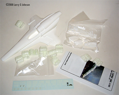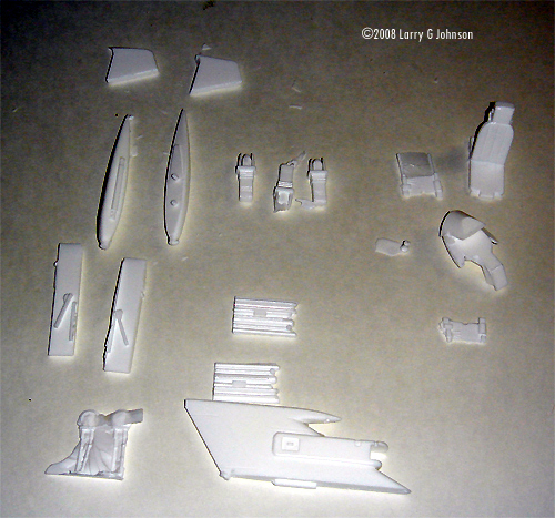 ^ What you get Image: Cockpit sidewalls Image: Engines and canopy (it's not that dark - the photo was tweaked so it could be seen) Image: Cannon muzzles ^ Main hull Image: Underneath Image: Cockpit parts ^ Parts is parts Image: Divots Image: Mold seams so faint .... Image: You can barely see them Image: Some flash on smaller bits though Image: Assembly guide Image: Finishing guide |