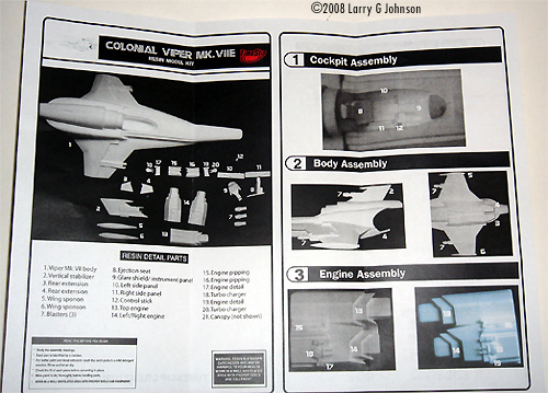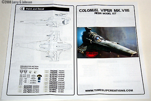 This Viper Mk. VIIE is the first, as I've heard, in a series of BSG Fighters all in the same 1/32nd scale as the Revell TOS Viper. If this turns out to be true I'll be collecting all of them! What You Get You get a nice, sturdy box with a nicely printed cover card. Inside, with all the peanuts that ensure unbroken shipping and a mess all over the floor for the cats to play with, are 23 white resin parts including the big honkin' main fuselage piece, three engines, a detailed 5 piece cockpit, fins, wing tips, laser apertures and other various detail pieces. There is also a clear vacuformed canopy. The parts are very cleanly molded with crisp detail. There are some minor mold seam halves that will easily sand away smooth. I can find no deformities or bubbles in my kit, just some pour stubs and some flash on the smaller parts. The most prominent pour stubs are some major remnants in the engine housing aft that will have to be sanded smooth for the engines to fit - but since the area will be covered by the engine exhausts, it's a not an area of great concern, just slightly difficult to reach. ALPS-printed waterslide decals provide markings for several pilots and tail codes from actual series rosters, along with standard stencils, fleet markings and instrument panels for the cockpit. They are nicely registered and printed. I can't say how they will lay down on the model yet but they are a bit difficult to see being light gray on pale blue decal paper. I suggest good lighting when cutting them out. The directions seem a bit basic but should get the job done adequately. Accuracy In ascertaining the accuracy of the kit I made a big mistake and almost made a fool of myself. I was comparing the kit to the Mk. VII Viper from the miniseries, capturing some shots of Apollo landing for decommissioning ceremony, and was listing page after page of errors. I mentioned this to John and he said, its not that Viper! Talk to George! So lucky enough, George was at the last club meeting and showed me my error. This is the Mk. VIIE from the Pegasus. After viewing some new pictures from Galatica Wiki and I'm happy to say that this kit is extremely accurate. This is NOT your Apollo's Mk. VII. Assembly Upon first examination it looks like this kit will go together quickly and easily with little hassles. My only complaint in the kit design is no landing gear or pilot, making both on the ground and in flight displays impossible or unreasonable. It will take major surgery to carve out the bays and major scratchbuilding to detail them and add landing gear. Simpler to modify a 1/32nd scale jet jockey to look something like a colonial pilot and slip it in the cockpit. Conclusions Well it's a no brainer: if you want a large scale Viper Mk. VIIE, this is the only game in town. Fortunately the kit is beautiful and for the price it's a big model when finished, very reasonable - large scale, excellently molded and goes side by side by side with the Revell kit. I just hope the rumor I heard is true and we will see a Mk II, the original Mk. VII, Blackbird and dare I hope, a Raptor in this scale. |