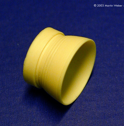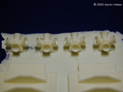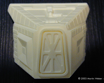 What You Get Contained in a ziploc bag are 37 resin pieces, one strip of styrene, a two-page manual and a decal sheet. The resin is of high quality, soft, and should be easy to whittle and sand. The resin surface is flat - which should offer the paint a nice surface to cling to. The pod is cast flawlessly, merely a few tiny bubbles are on the manuevering jets and the landing engines. Assembly & Finish The main body of the pod is made up of 6 resin parts. The outer walls and the two extensions are broken down into 4 hollow-cast pieces. The pouring channels for the extensions are 3mm thick, and are easily removed with a motor tool. Don’t cut too close too the model - leave a bit that you can carefully cut with a knife and sand. One extension takes about 30 minutes of cleanup. The instructions are easy to understand and visually aided with good pictures. If you want to build the 22“ version, the main body must be shortened by one centimeter. This one centimeter is well placed and recognizable at the center of the pod. Removing it should be no problem. A test-fit of the side extension to the main body showed an excellent fit. When cemented properly, no filling/sanding is necessary. This also goes for the rest of the Pod. If you work slowly and cleanly, filling will be at a minimum. The decals are printed on peel-and-stick paper. The printing Quality is good and the paper is very thin. The Deluxe Version contains waterslide decals. The smaller pieces are cast in very good quality and only require a bit of sanding to remove the excess resin. There are tips in the instructions on how to paint the pod, however I would still recommend browsing the ‘net for additional pictures. |