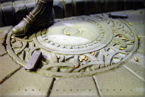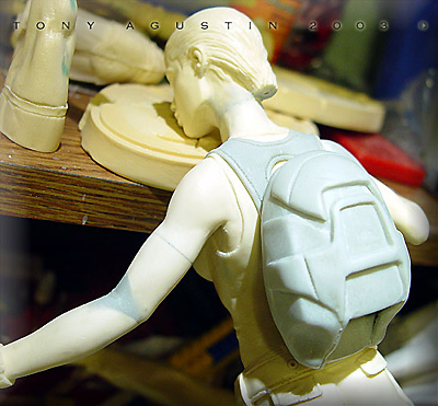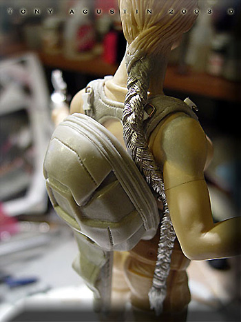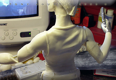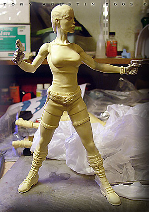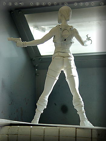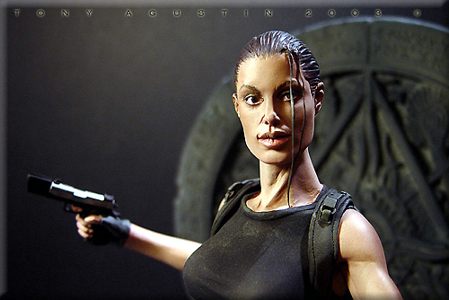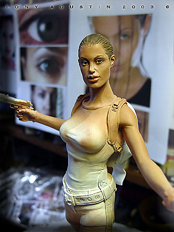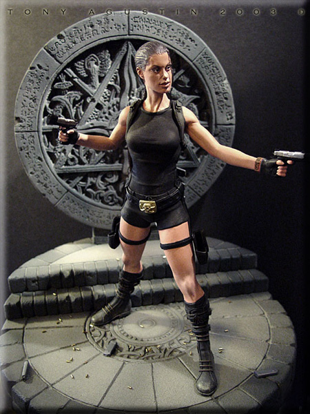 A couple of years ago I found this figure kit of Angelina Jolie at a local Chicago Model Convention. It is a Jimmy Flintstone figure called 'Raider Girl'. I thought it was a remarkable sculpt and the likeness was very good. One problem I had with the figure was the pose was too stiff and unnatural. This figure was going to be my first venture into the world of re-posing. I would also get introduced to a material called BalsaFoam. This won Best Female Figure at Kitbuilders 2003 and also won Silver at Wonderfest 2003. |