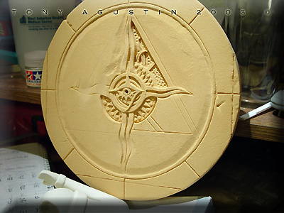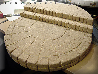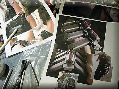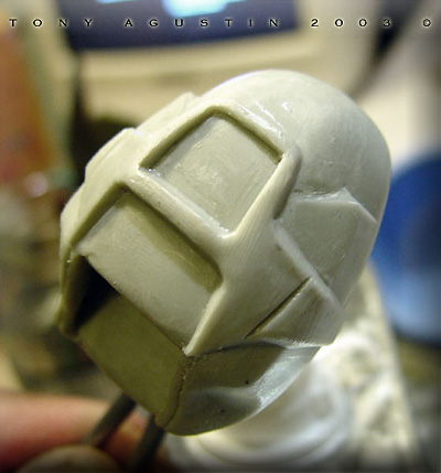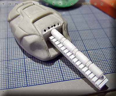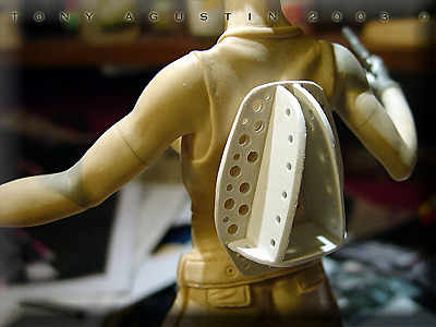 Image: The first thing was to decide on a more naturalistic stance. Once that was decided I beheaded the figure with a razor saw and reattached it with brass rod. Image: The same thing went for the right shoulder... Image: ....and the left elbow. Image: Only three major cuts needed to be made. Image: I used epoxy putty to re-sculpt neck details... Image: ...and the arm details. Image: This re-posed figure looks much better now. Image: The one thing the figure didn't have was the ammo backpack. I had to make it from scratch so I took some screen grabs off the DVD of the movie for reference. Image: I sketched out the parts I thought needed to be made. Image: The inner frame of the pack was made of thick styrene. Holes were drilled into it so the epoxy putty could have something to grab onto. Image: I used Magic-Sculpt to fill out the pack. I love this stuff. Image: The putty was laid down in layers until the form took shape. Image: A harness needed to be sculpted as well. Image: Styrene structural shapes were cut and assembled to make this whats-a-ma-widget. Image: Ammo clips and clip mounts for the pack needed to be cast up into many many pieces. Image: The original guns weren't too good so I modified them with extra styrene bits to make them look like the movie guns. Image: The pack and harness was sculpted. Little buckles were made with styrene and paper clips. The kit supplied pony tail was made of white metal and had to be carefully bent to conform around the pack and behind her arm. Image: This figure needed a cool base so I sketched out my own version of this circular carving but with a huge gem in the middle. Image: I found this material called Balsa Foam and with little dental and sculpting tools.... Image: ....proceeded to slowly carve out the details. Image: Here the main disk is finished and being protected with primer. If I had to do this part over again I would have brushed on clear resin instead for strength if I had known. Image: The Base was made of 4 layers of particle board. Individual stones were carved in. Image: The center of the base where the figure would stand looked too plain, so I took a thin slice of Balsa Foam and carved in new details for interest. Image: The figure was sprayed with white primer direct from the can. I prefer to prime figures with a white primer. Image: The first colors are airbrushed on. Other details were done with a paint brush and colored pencils. Image: Loose strands of hair were cut from scrap vinyl lettering sheets. Epoxy putty was used to blend the strands to the hair line. |