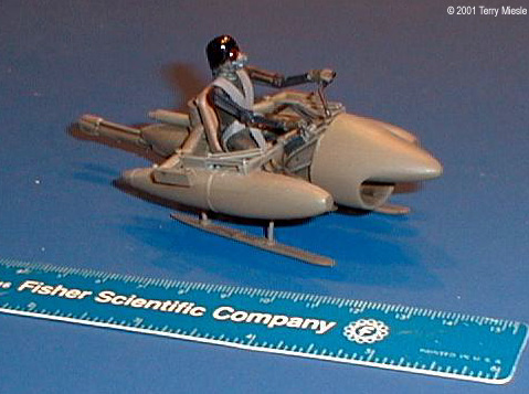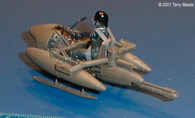 The Sharkit Jet Speeder Bike kit is part of a two-bike set sold together. This half of the kit is 10 pieces: 3 body, 2 skids 1 seat, 2 hardpoint racks and 2 droptanks (optional rack and tanks). The android pilot is 9 pieces. The resin is of excellent quality, though several parts are cast in open molds, which means you'll need to sand them on wet paper and a smooth, hard surface. The resin required almost no cleanup, only a few seamlines required sanding, and no filler was needed. I don't need to say this is unusual and most impressive. The builder will need to supply bits