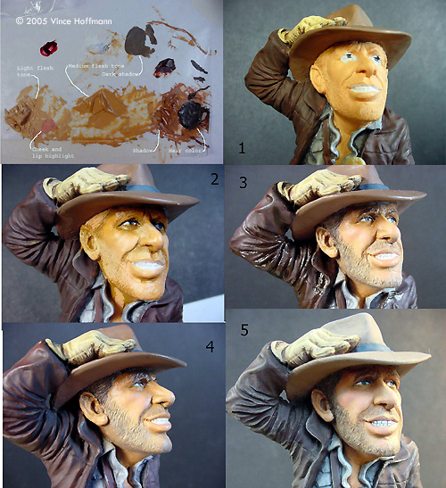 I picked up the display model, examined it closely and saw that the level of detail sculpted into this little figure was quite impressive! I had seen caricature sculpts before and the attention to detail would generally lack because of the subject matter, but not here. $15.00 later Indy found a new home. Overview As a nicely sculpted 120mm figure, this kit is an excellent opportunity to practice your painting skills. There is no need for instructions and painting is left to your imagination. Casting quality is good with minor seam lines visible down the arms and legs, and other seam lines cleverly hidden along natural breaks and texture changes. The detail is quite deep in some areas and small bubbles had to be popped out of many of these recesses. Cleanup and Assembly After the visible seam lines were cleaned up with a file and sandpaper, all of the parts were washed using Formula 409 and water. This very effectively removes all casting residue and finger oils. For ease in painting and to reduce handling, the figure and base were mounted on a 4"x8"x1/2" wood block with a short brass pin. The parts were then primed with lacquer based primer and set aside to dry. Base Colors The first paint to go on was acrylic, mixed to closely match the final color. No shadowing was done at this point; the objective here is to provide a flat layer of color to act as both an adherent for the oil paint to come, and a neutral color to which the shadows and highlights would be applied. After the facial flesh color dried, a very light grey base color was painted over the eyes and teeth. Painting From the Bottom Up I chose a heavy-handed approach to painting this figure; I wanted every shadow to be darker than normal, and every highlight to be lighter. It is a caricature after all! Windsor and Newton oil paints were used for the final colors, shadows and highlights. For Indy's pants, yellow ochre, white, raw umber and a touch of blue were blended to make a nice medium khaki color. For the shirt, white, black and a tiny touch of blue made a nice grey color. For the jacket, a leather tone was created by blending a small amount of raw umber with brown made from red, blue and yellow. Indy's hat is the same brown blend, with white added instead of raw umber to give it a bleached appearance. The glove colors are a lighter variation of the khaki used for the pants. From each of these colors, separate blends for the shades and highlights were created. Working from dark to light, the medium shadows were applied to the folds; highlights were applied to the high spots, and blended in the middle. Dark shadows and light highlights were added afterward to create more depth. Additionally, the undersides of the legs, arms, hat and jacket were given a forced perspective shadow treatment by making these areas typically darker than the surroundings. The intent here is to create a 60 degree sun direction (from the front) therefore, everything below and behind will be generally darker. Because paint was used to create the shadows and highlights, neither a wash nor a dry brush treatment was necessary to bring out the detail. |