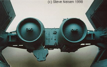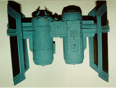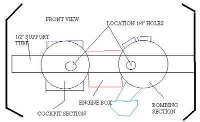 STEP 5 WING SUPPORT/BODY TUBES: Next, I cut the 1/2" tube to about 9" long. This became the center support tube running through the two body parts and engine box. Then I cut 2 sections of the 2" tube in equal 4" lengths. I drilled 1/2" inch holes through the 2 bodies leaving about 1/2" to the front of the body sections. When I finished drilling the holes in each I slid them on the support tube temporarily. I then marked the support tube for two 1/4'-diameter locating holes - one in the cockpit section the other in the bombing section. STEP 6 COCKPIT: This is made from one of the 4" tubes, a 2" hemisphere, and the 'grill' from the Vader's TIE fighter. I cut off the top of the hemisphere so the grill fit snugly on it. Then I took a scribing tool to the 4" tubes and scribed all body panel lines on both, sing my references as a placement guide. I placed the cylinders into a door jamb and used the edge as a guide to achieve straight lines lengthwise on the body tubes. I used a flexible plastic ruler as a guide to scribe lines around the circumference of the tubes. |