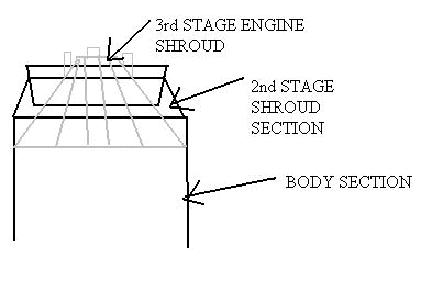 STEP 8 ENGINE BOX : This is the box located between the two bodies. I have checked various references and they all agree that this is the engine. I placed both the bodies on the support tube and marked their inner placement. I then used sheet styrene following my reference pictures and built up a basic box. I marked each piece accordingly TOP, FRONT, REAR and BOTTOM and set them aside. STEP 9 REAR BODY ASSEMBLIES: This is where the parts mentioned from the 2 Saturn V kits are used. I measured and cut the appropriate sections from the 2nd stage reducer to match the diameter of the body tubes (these are the pieces that have all the ribs). These pieces gives the bodies the taper in the rear section. When this was done I took an LEM base ring, inverted it and slid it into the ribbed sections. The end stuck out but I sanded off the extra to achieve proper size. Before gluing the two pieces to the rear sections I placed the third stage engine shroud in the rear of the body tubes, then attached the other assembled pieces. I dry fit all the pieces together before using any glue to get a understanding first of how they fit. |