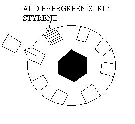 STEP 7 TORPEDO LAUNCHER/BOMBER BODY FRONT: Once again, I thoroughly studied my reference pictures. I cut out 8 equal squares from around the edge of the 2" flat dish. After this I cut a hexagon shape from the center of the dish (this is were the torpedoes are fired). After I finished cutting, I sanded the dish smooth and placed small sections of lined styrene behind the little squares I cut out - checking my references for placement. |